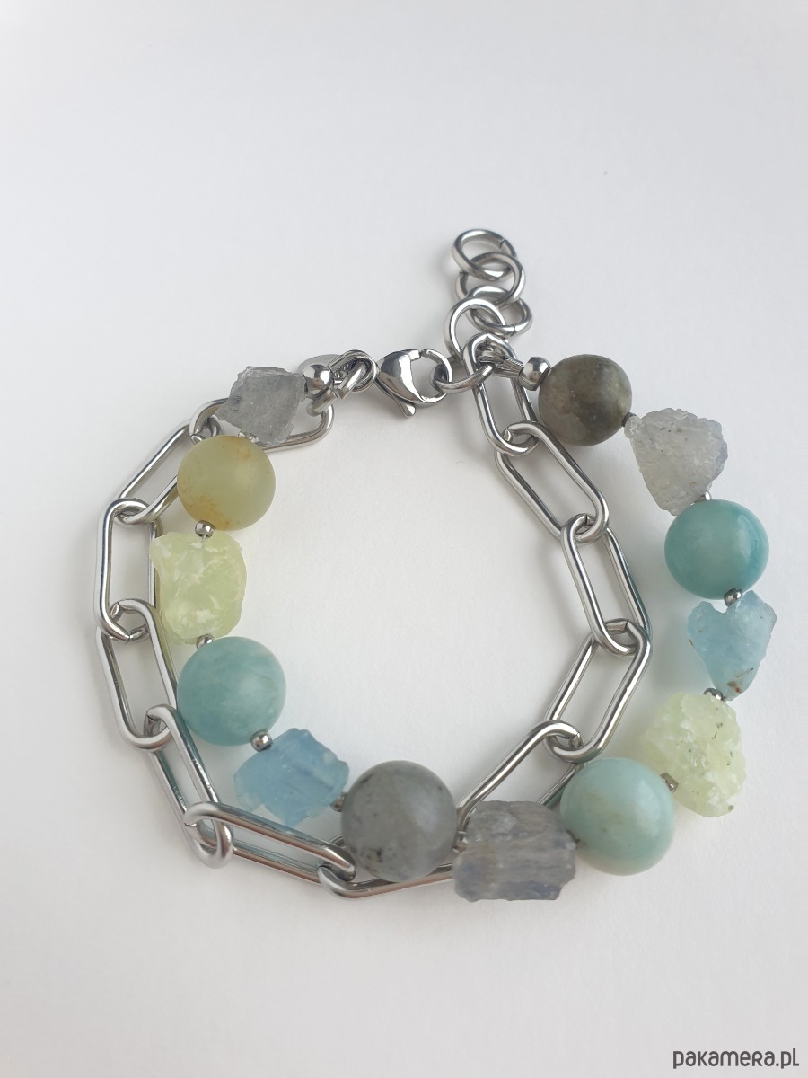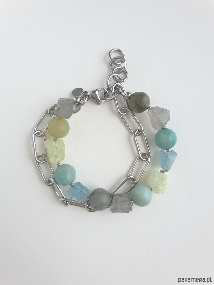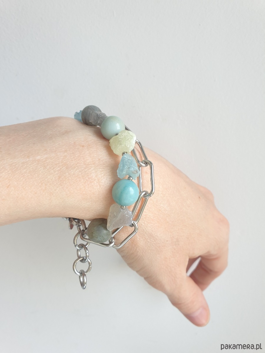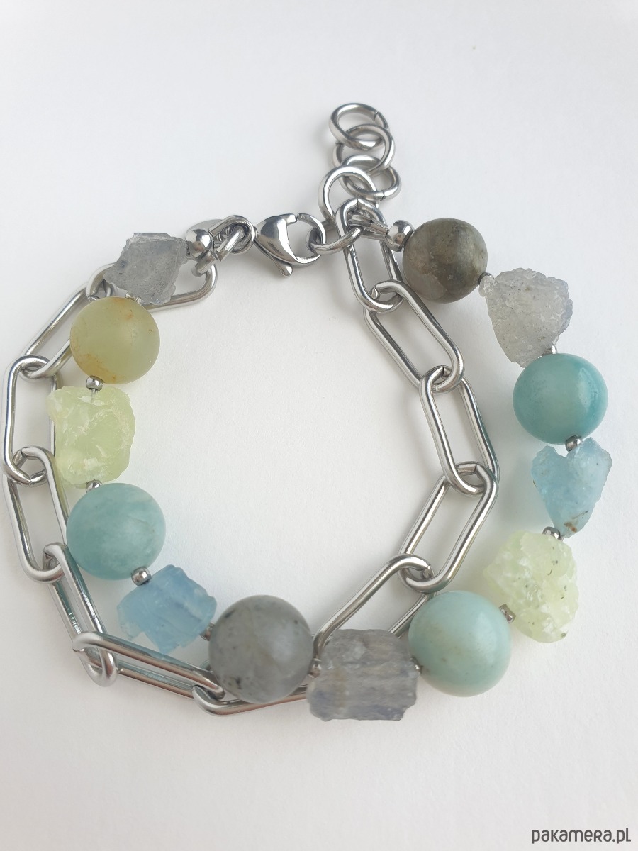 Bransoletka RAW z grubym łańcuchem, akwamaryn, amazonit, labradoryt, phrenit