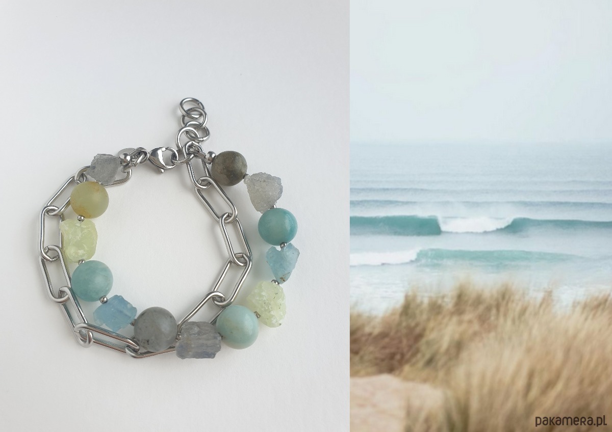 Duża bransoletka z kolekcji RAW inspirowanej żywiołami, tutaj żwioł wody, w kolorach niebieskiego, turkusu, jasnej zieleni i szarego. Tworzona ręcznie z kamieniami naturalnymi, surowymi i szlifowanymi w kształcie kuli, tutaj akwamaryn, phrenit, amazonit, labradoryt, grubym łańcuchem i elementami ze stali szlachetnej. Na zdjęciu przykładowa bransoletka, tworzę ją z tych samych kamieni i elementów w tej samej tonacji jednak może się minimalnie różnić bo każdy kamień jest wyjątkowy. Bransoletkę mogę zrobić z dowolnymi kamieniami które mam w ofercie, napisz jeśli masz jakieś marzenie.