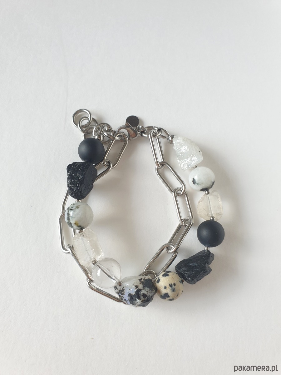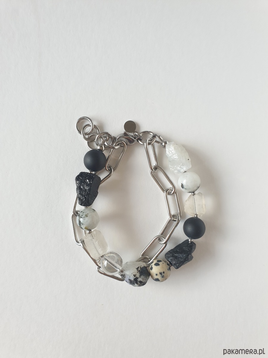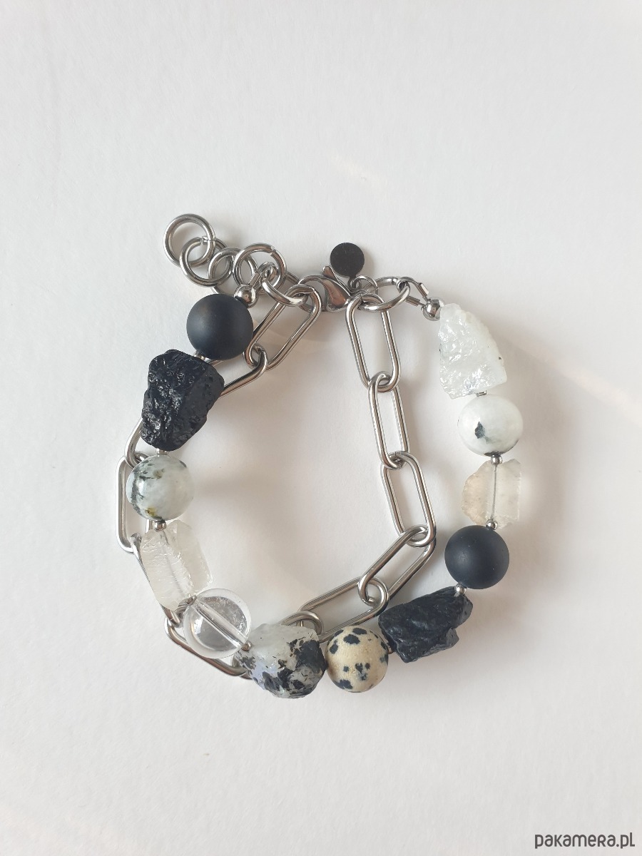 Duża bransoletka z kolekcji RAW w kolorach bieli, czarnego i szarego. Tworzona ręcznie z kamieniami naturalnymi, surowymi, tutaj kryształ górski, czarny turmalin, kamień księżycowy, jaspis dalmatyński, grubym łańcuchem i elementami ze stali szlachetnej. Na zdjęciu przykładowa bransoletka, tworzę ją z tych samych kamieni i elementów w tej samej tonacji jednak może się minimalnie różnić bo każdy kamień jest wyjątkowy. Bransoletkę mogę zrobić z dowolnymi kamieniami które mam w ofercie, napisz jeśli masz jakieś marzenie.