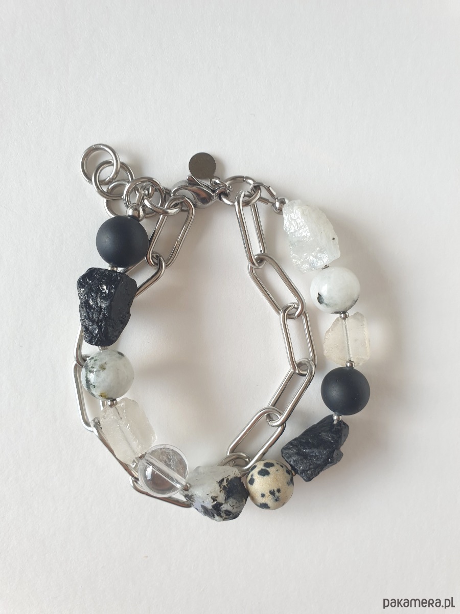 Duża bransoletka z kolekcji RAW w kolorach bieli, czarnego i szarego. Tworzona ręcznie z kamieniami naturalnymi, surowymi, tutaj kryształ górski, czarny turmalin, kamień księżycowy, jaspis dalmatyński, grubym łańcuchem i elementami ze stali szlachetnej. Na zdjęciu przykładowa bransoletka, tworzę ją z tych samych kamieni i elementów w tej samej tonacji jednak może się minimalnie różnić bo każdy kamień jest wyjątkowy. Bransoletkę mogę zrobić z dowolnymi kamieniami które mam w ofercie, napisz jeśli masz jakieś marzenie.