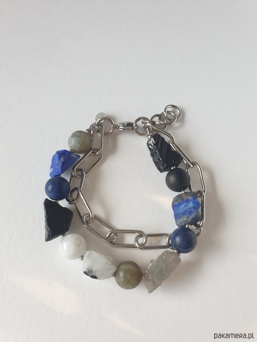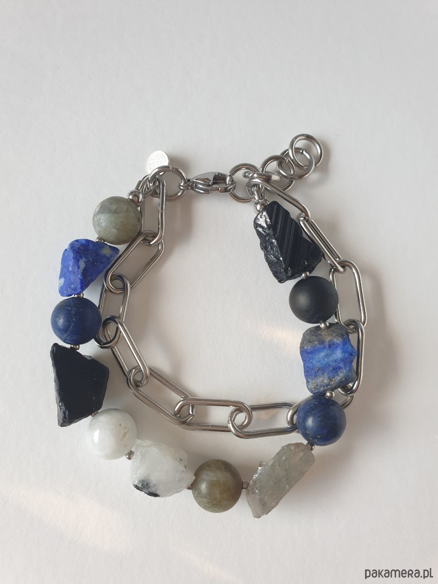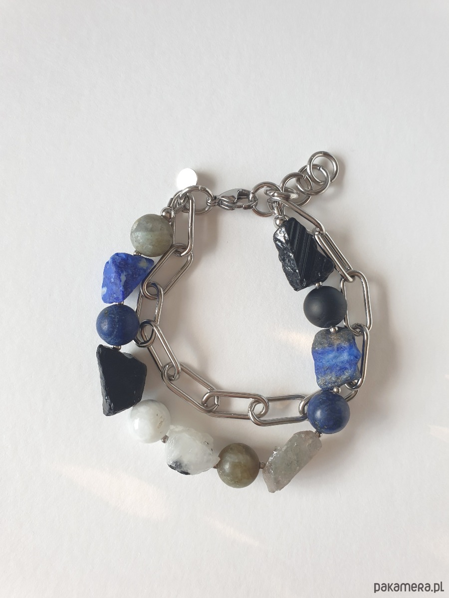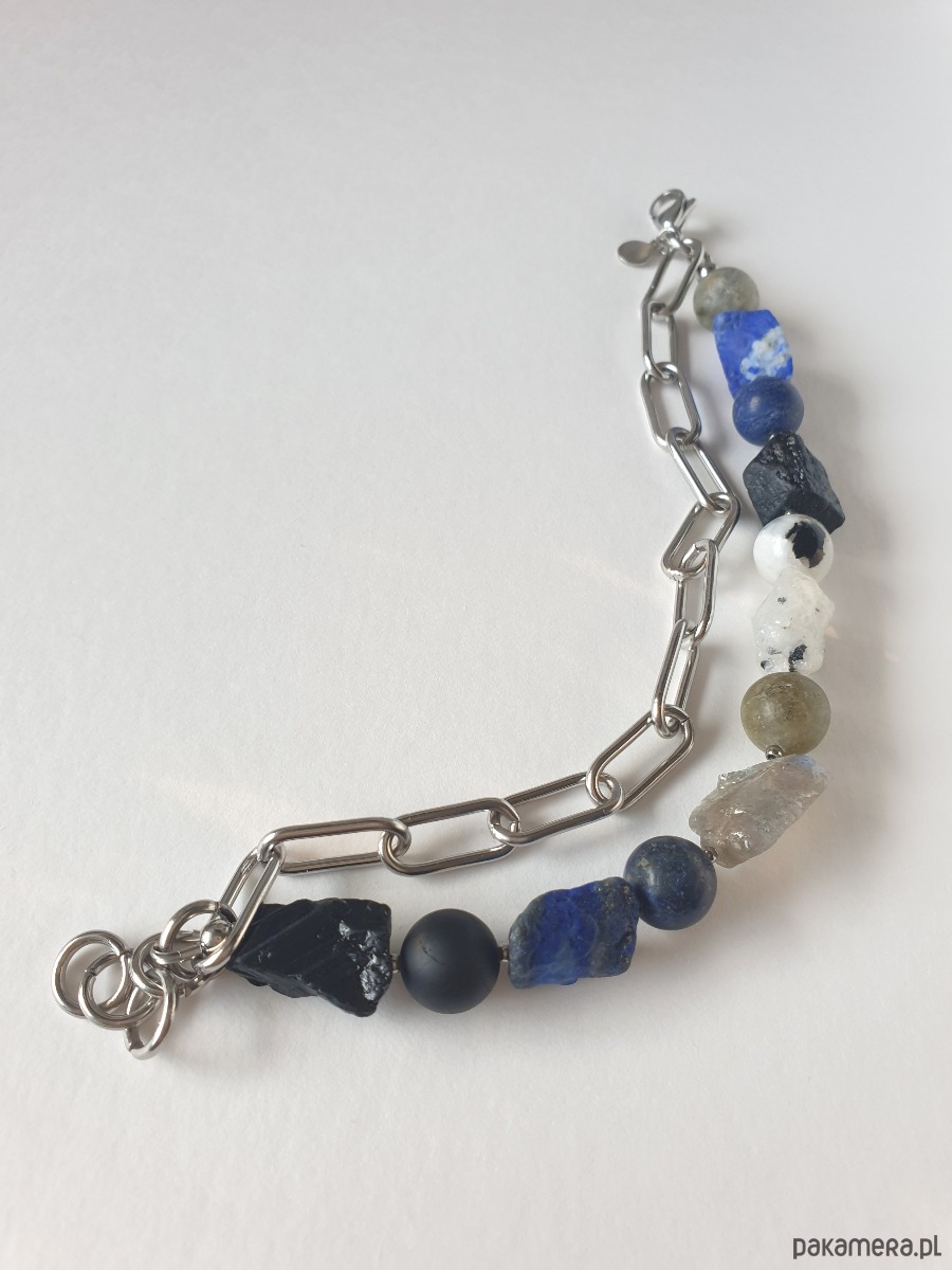 Duża bransoletka z kolekcji RAW w kolorach niebieskiego, granatu, czarnego i szarego. Tworzona ręcznie z kamieniami naturalnymi, surowymi, tutaj lapis lazuli, czarny turmalin, labradoryt, kamień księżycowy, grubym łańcuchem i elementami ze stali szlachetnej. Na zdjęciu przykładowa bransoletka, tworzę ją z tych samych kamieni i elementów w tej samej tonacji jednak może się minimalnie różnić bo każdy kamień jest wyjątkowy. Bransoletkę mogę zrobić z dowolnymi kamieniami które mam w ofercie, napisz jeśli masz jakieś marzenie.