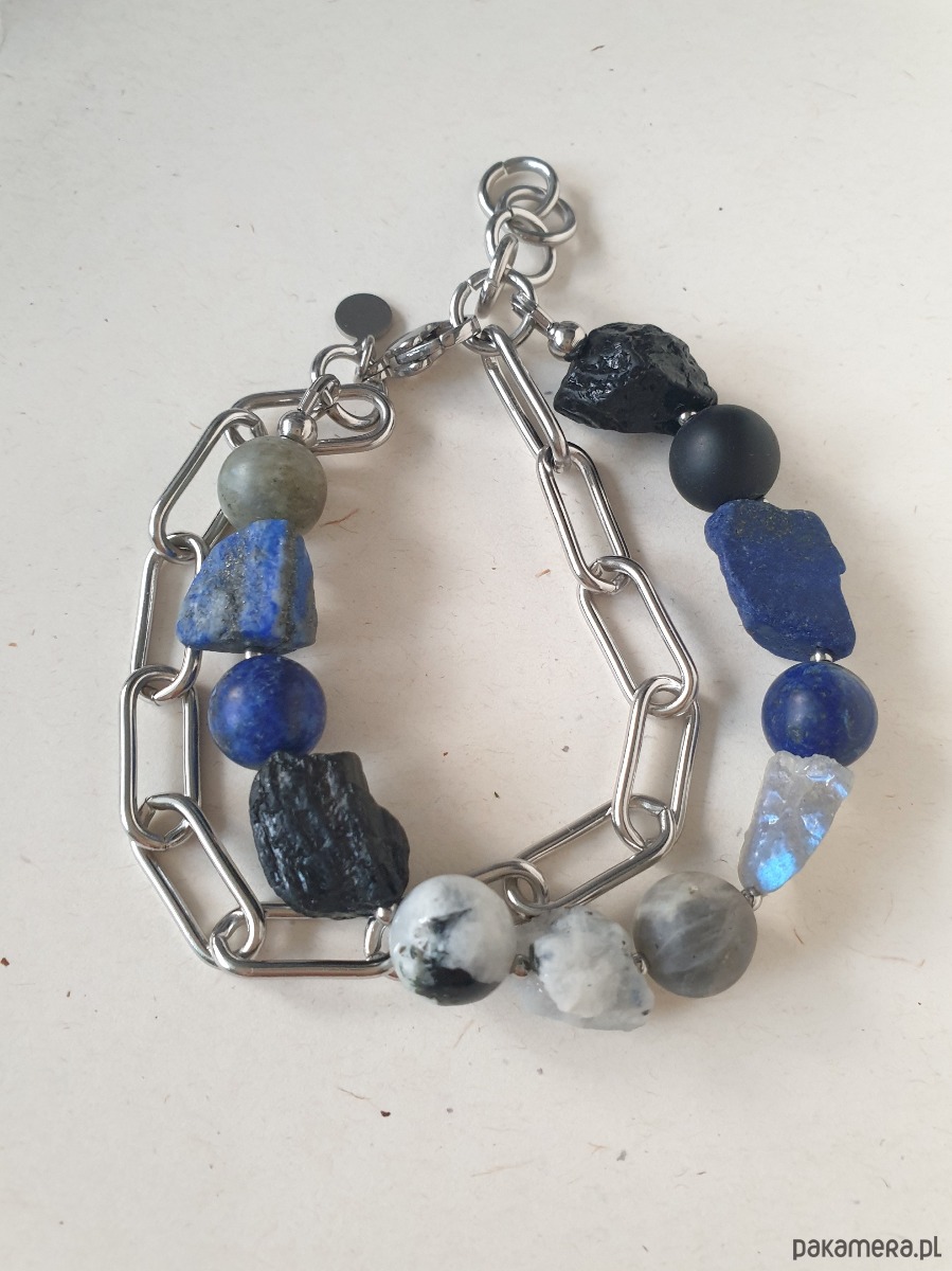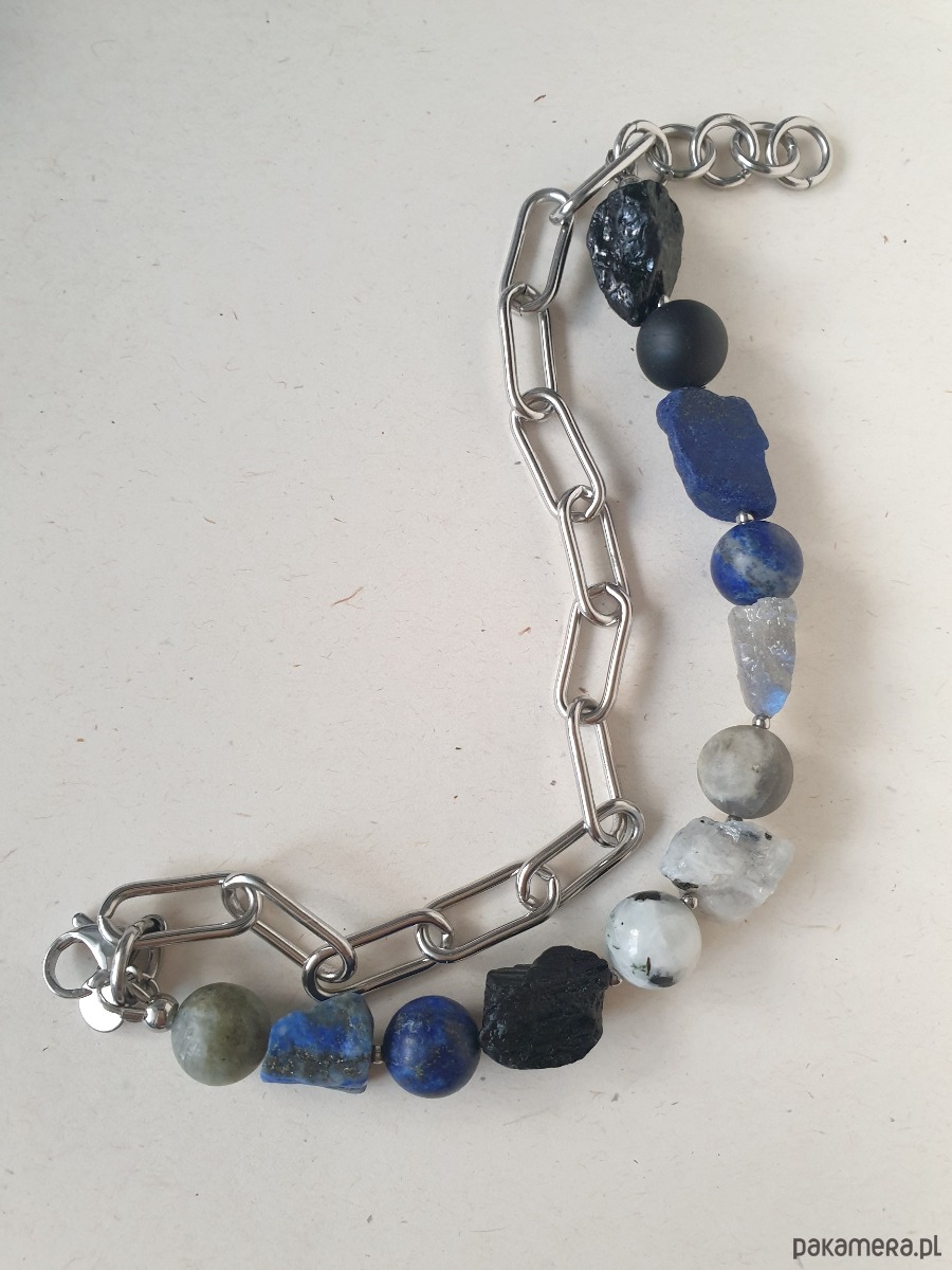 Duża bransoletka z kolekcji RAW w kolorach niebieskiego, granatu, czarnego i szarego. Tworzona ręcznie z kamieniami naturalnymi, surowymi, tutaj lapis lazuli, czarny turmalin, labradoryt, kamień księżycowy, grubym łańcuchem i elementami ze stali szlachetnej. Na zdjęciu przykładowa bransoletka, tworzę ją z tych samych kamieni i elementów w tej samej tonacji jednak może się minimalnie różnić bo każdy kamień jest wyjątkowy. Bransoletkę mogę zrobić z dowolnymi kamieniami które mam w ofercie, napisz jeśli masz jakieś marzenie.