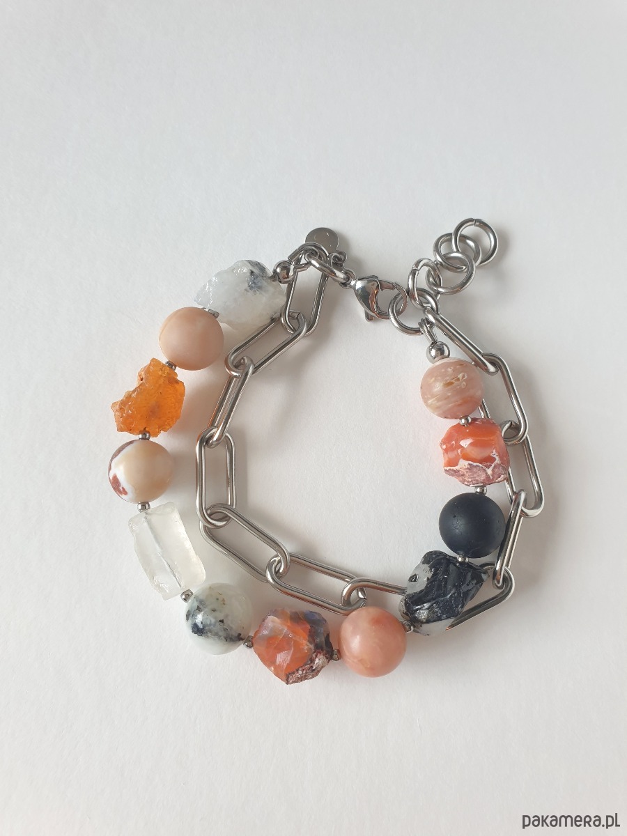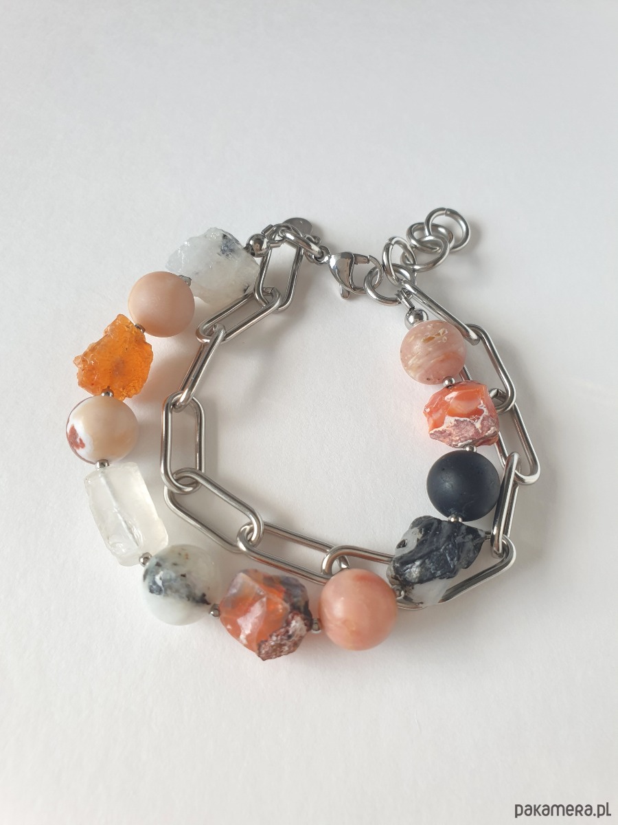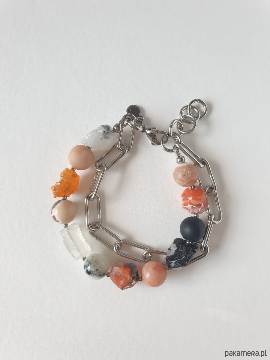 Duża bransoletka z kolekcji RAW w kolorach pomarańczowego, czarnego i szarego. Tworzona ręcznie z kamieniami naturalnymi, surowymi, tutaj opal ognisty, opal różowy, kamień słoneczny, czarny turmalin, kryształ górski, kamień księżycowy, grubym łańcuchem i elementami ze stali szlachetnej. Na zdjęciu przykładowa bransoletka, tworzę ją z tych samych kamieni i elementów w tej samej tonacji jednak może się minimalnie różnić bo każdy kamień jest wyjątkowy. Bransoletkę mogę zrobić z dowolnymi kamieniami które mam w ofercie, napisz jeśli masz jakieś marzenie.