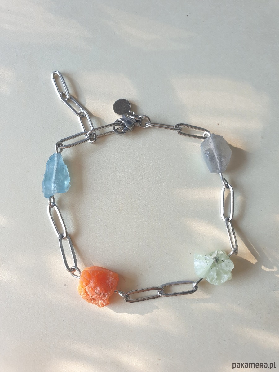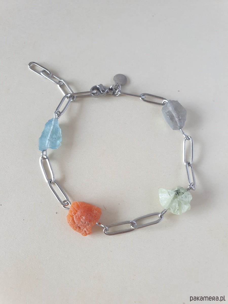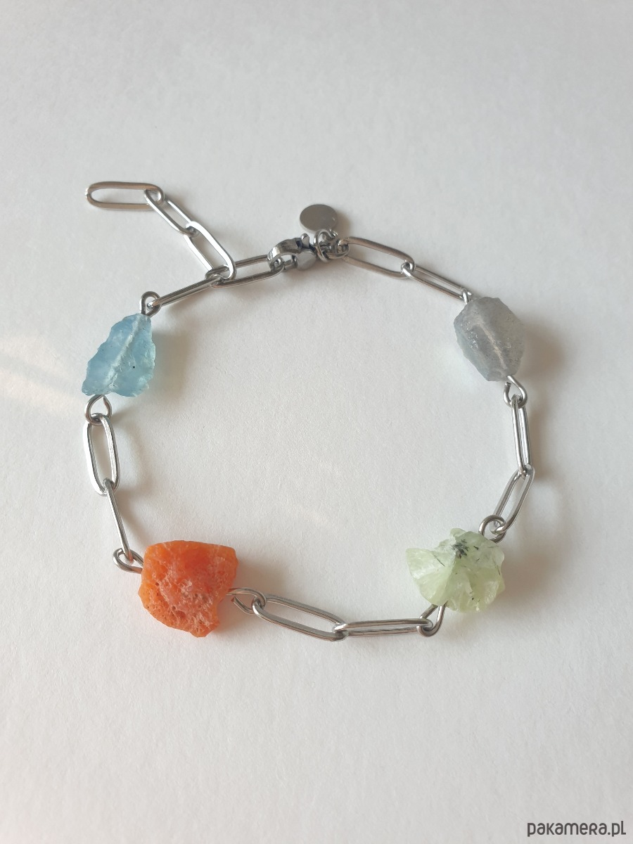 Tworzona ręcznie z łańcuszka i elementów ze stali szlachetnej z kamieniami naturalnymi, surowymi, tutaj