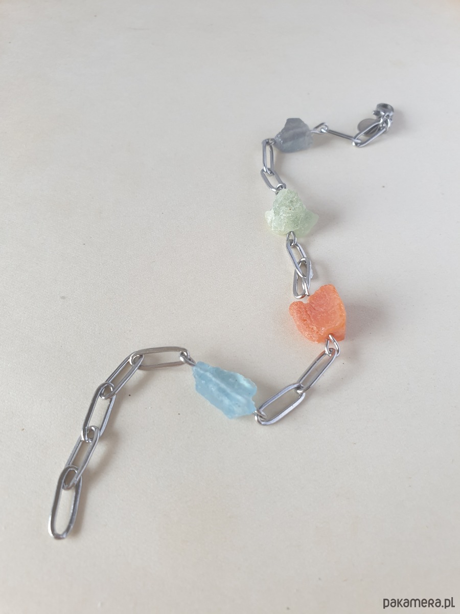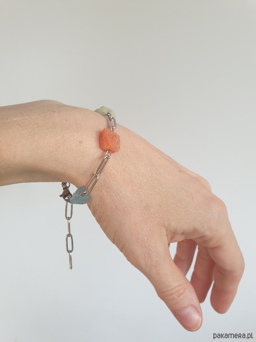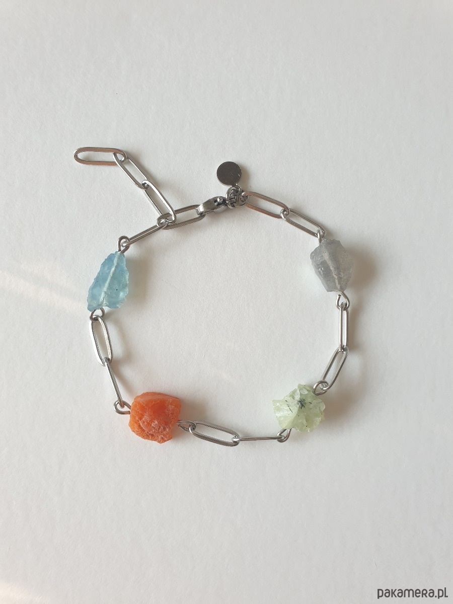 Tworzona ręcznie z łańcuszka i elementów ze stali szlachetnej z kamieniami naturalnymi, surowymi, tutaj