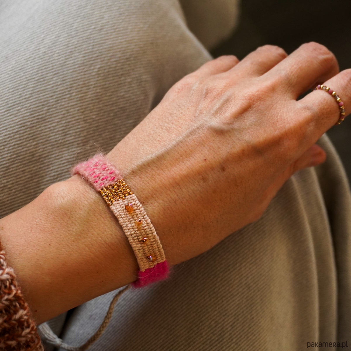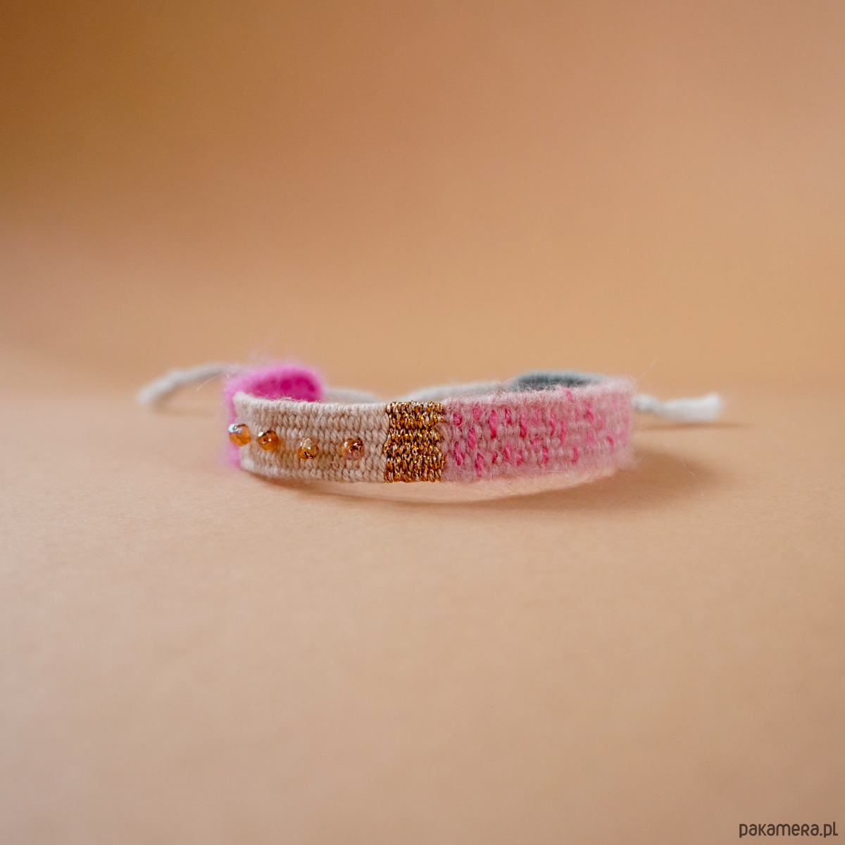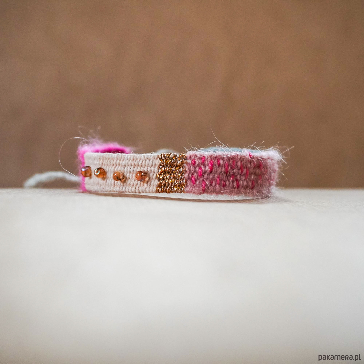 Śliczna bransoletka ręcznie wykonana na krośnie z koralikami i haftem. Szerokość około 1 cm. Długość około 15 cm. Sznureczki, które samodzielnie wiążemy na supełek, w razie potrzeby dodają bransoletce kilka centymetrów. Została wykonana z bawełny, moheru, lnu I nici metalizowanej. Koraliki są szklane. Serdecznie zapraszam :)