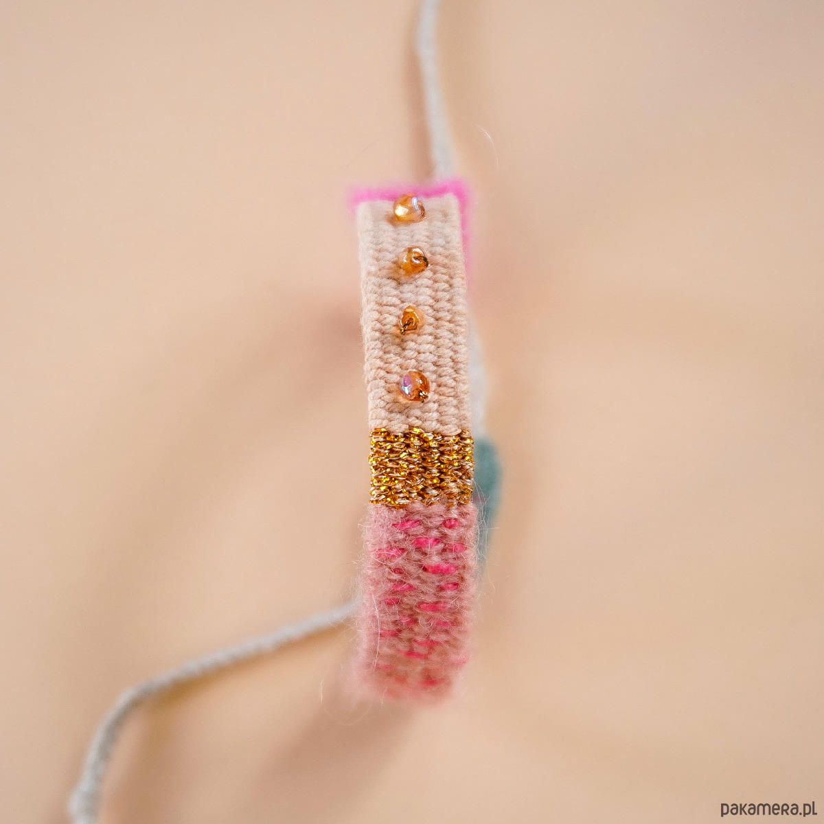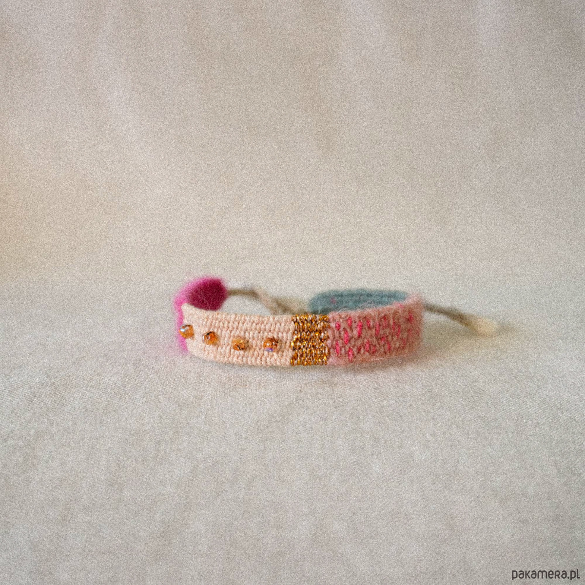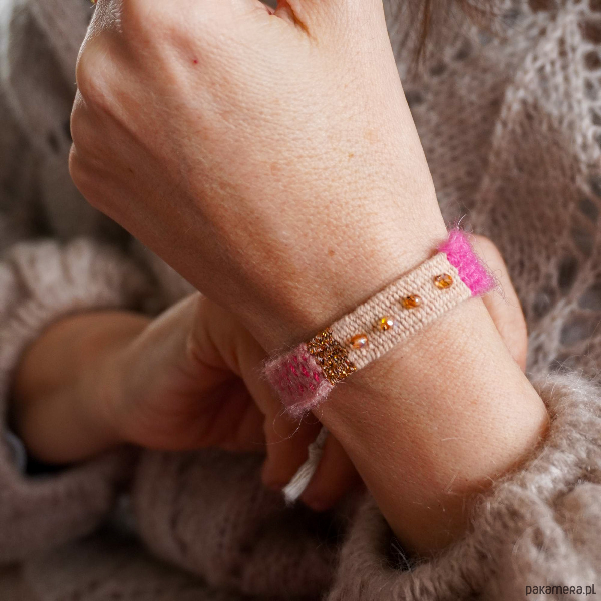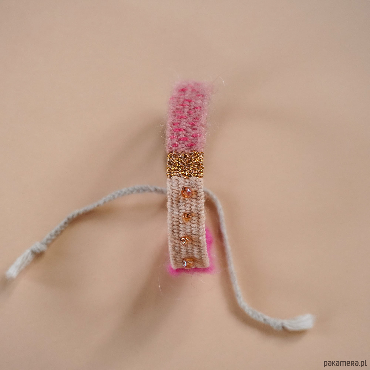 Śliczna bransoletka ręcznie wykonana na krośnie z koralikami i haftem. Szerokość około 1 cm. Długość około 15 cm. Sznureczki, które samodzielnie wiążemy na supełek, w razie potrzeby dodają bransoletce kilka centymetrów. Została wykonana z bawełny, moheru, lnu I nici metalizowanej. Koraliki są szklane. Serdecznie zapraszam :)