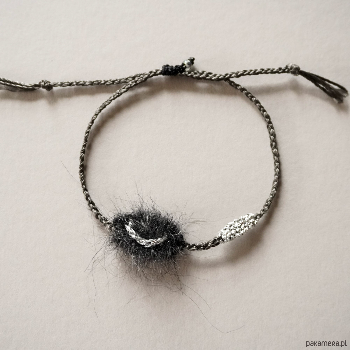 Wyjatkowa bransoletka na sznureczku z dwoma tkanymi ręcznie elementami i haftem księżyca. Zapięcie jest makramowe, umożliwia wygodną regulację :). Zapraszam serdecznie :)