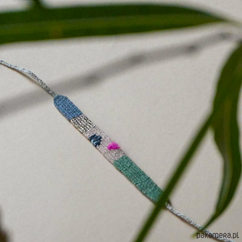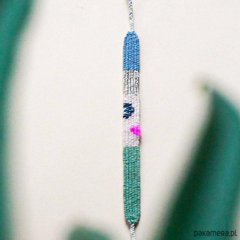 Bransoletka tkana ręcznie na krośnie. Została wykonana z włóczki bawełnianej, wełnianej (alpaka, moher) i lnianej. Szerokość około 1 cm , długość części tkanej około 14,15 cm plus sznureczki. Polecam serdecznie