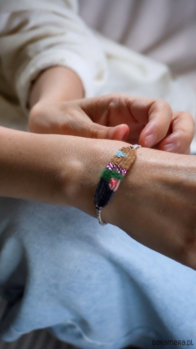 Mini bransoletka, wykonana ręcznie na krośnie w cudownych kolorach. Jesli masz taką potrzebę możesz odkryć w niej pewien wspierający przekaz 🎀🩷. Część tkana ma około 3 cm długości, około 1 cm szerokości. Bransoletkę wiążemy samodzielnie, dość mocno na supełek.