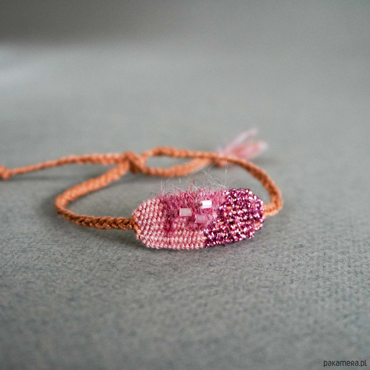 Przepiękna, delikatna, kobieca bransoletka, wykonana ręcznie na krośnie. Część tkana ma około 3 cm długości, około 1 cm szerokości. Bransoletkę wiążemy samodzielnie, dość mocno na supełek. Bransoletka jest idealna na szczupłe nadgarstki, dla osób lubiących nosić bransoletki w zestawach lub dla tych którzy lubią delikatną biżuterią. Polecam serdecznie również na prezent :)