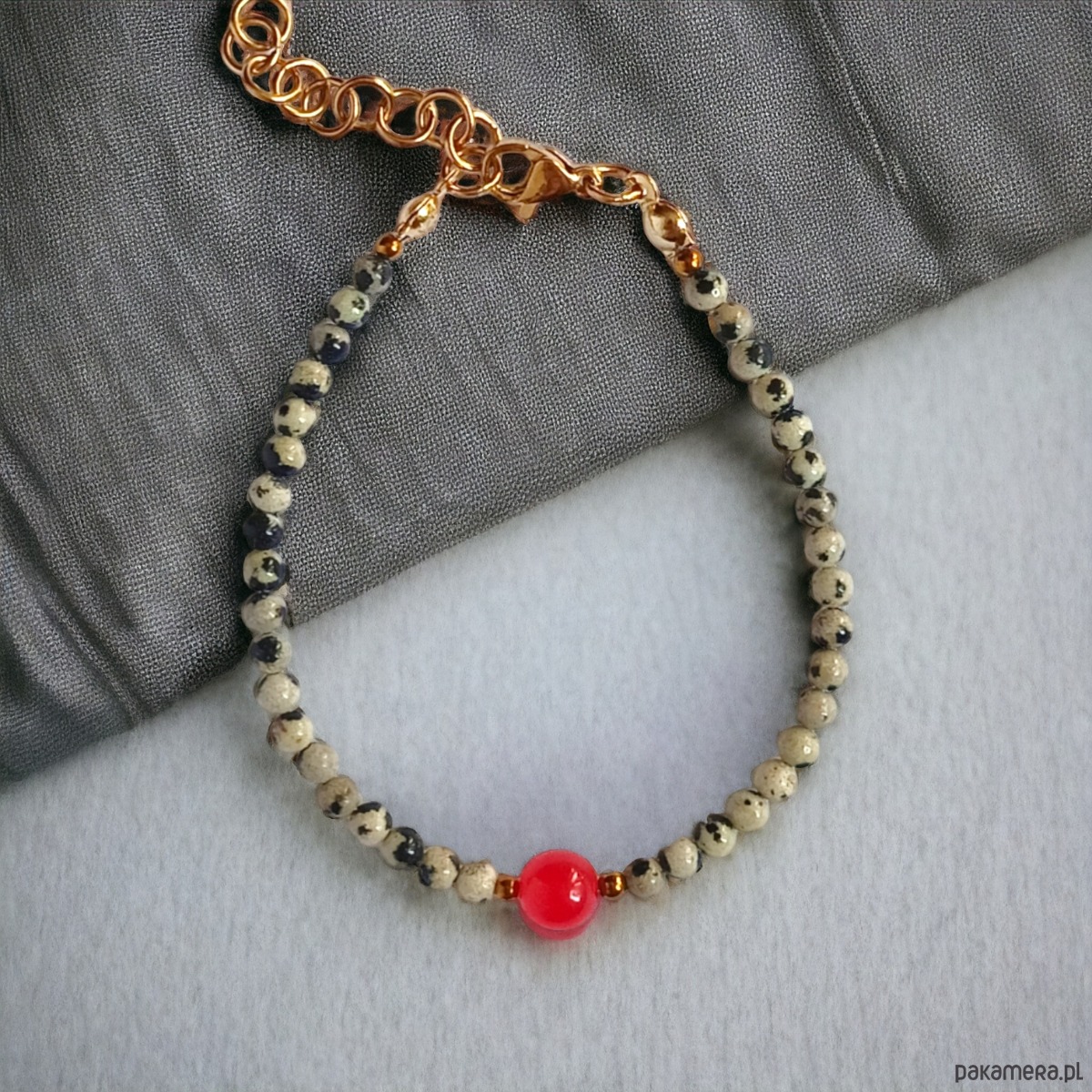 Bransoletka na solidnej lince stalowej (miękkiej) - została wykonana z drobniutkich kuleczek jaspisu dalmatyńskiego 3mm, przekładek ze złotego hematytu oraz kontrastujących kul jadeitu w soczystym odcieniu czerwieni (6mm)