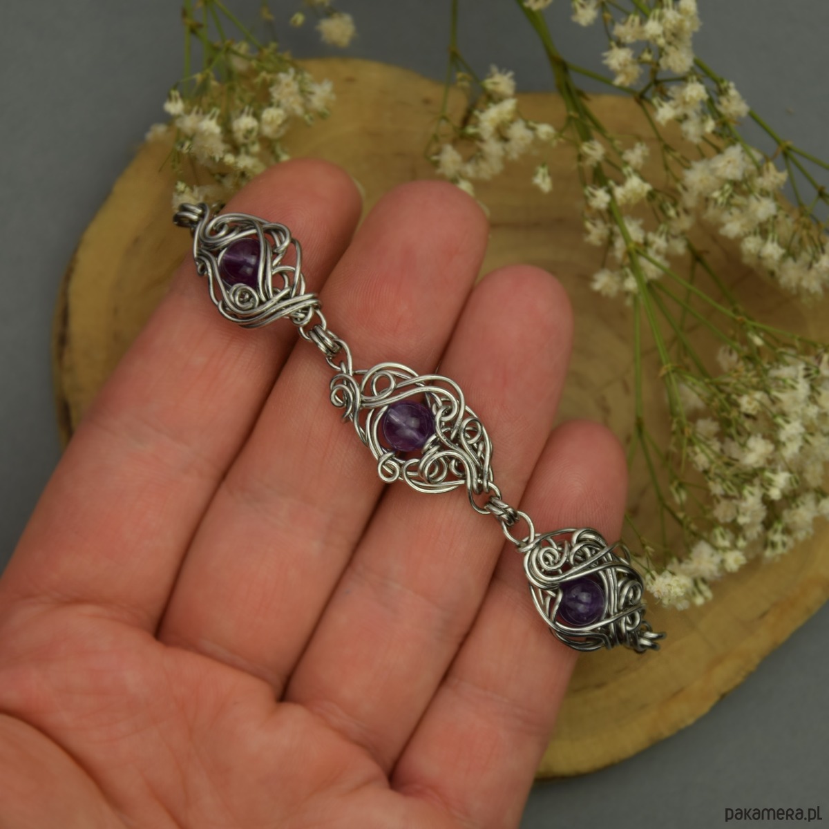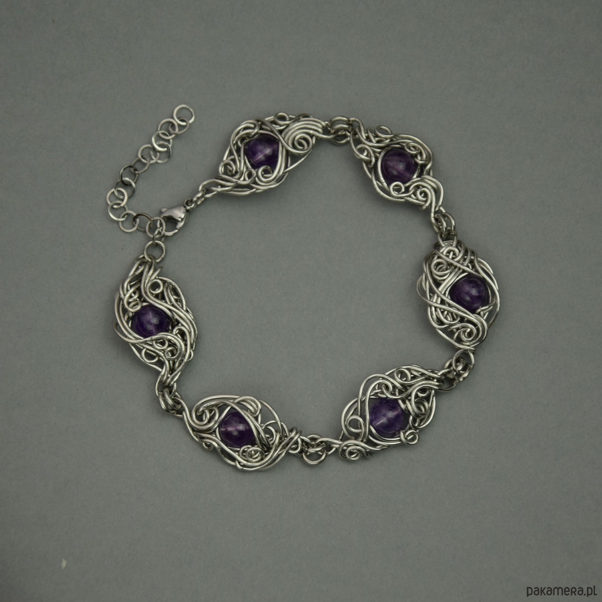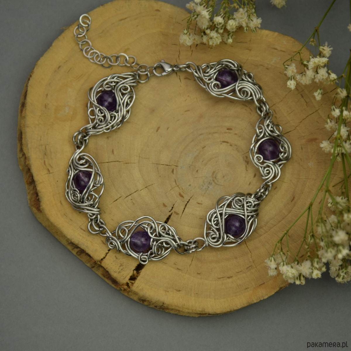 Ręcznie robiona bransoletka z fioletowymi ametystami. Wykonana techniką wire wrapping z drutów ze stali chirurgicznej.