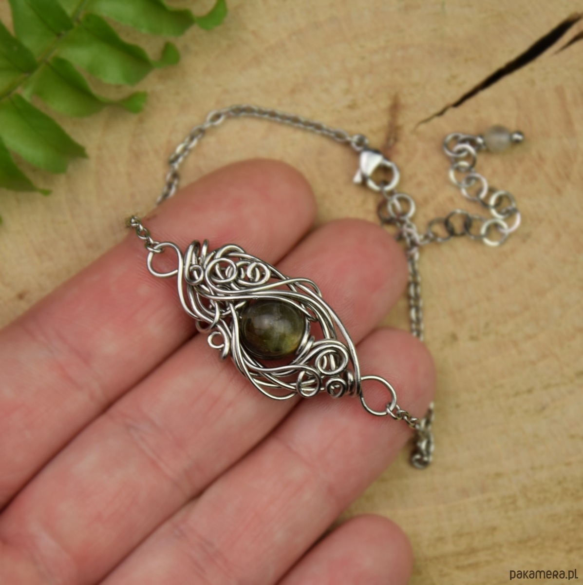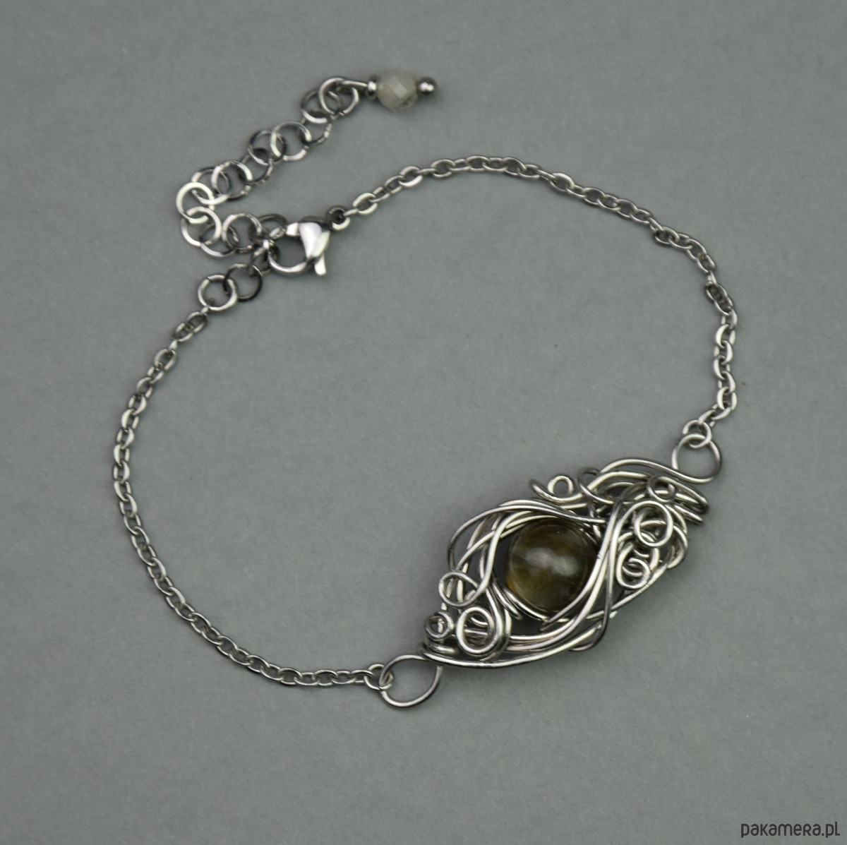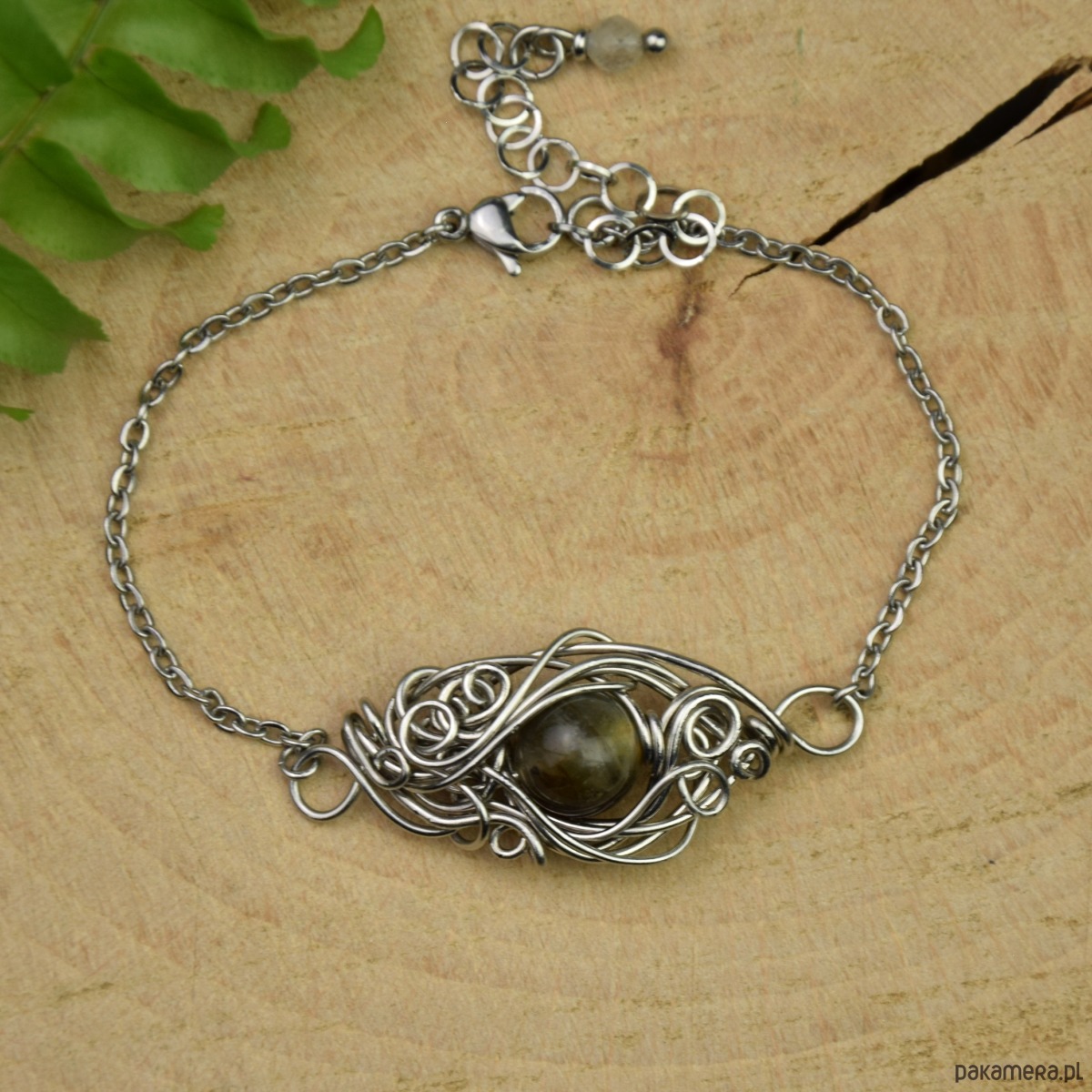 Ręcznie robiona bransoletka z labradorytem, wykonana techniką wire wrapping, w całości ze stali chirurgicznej.