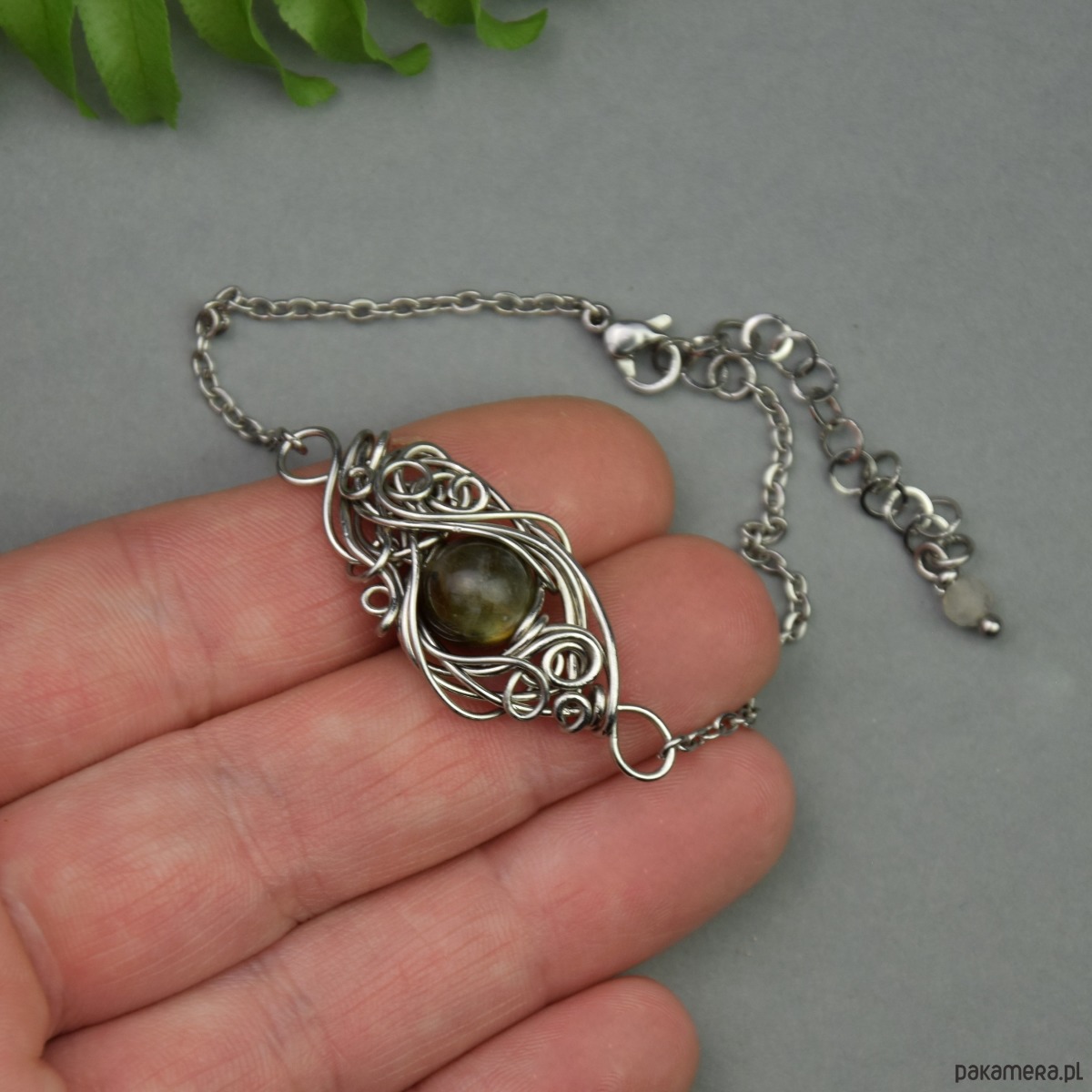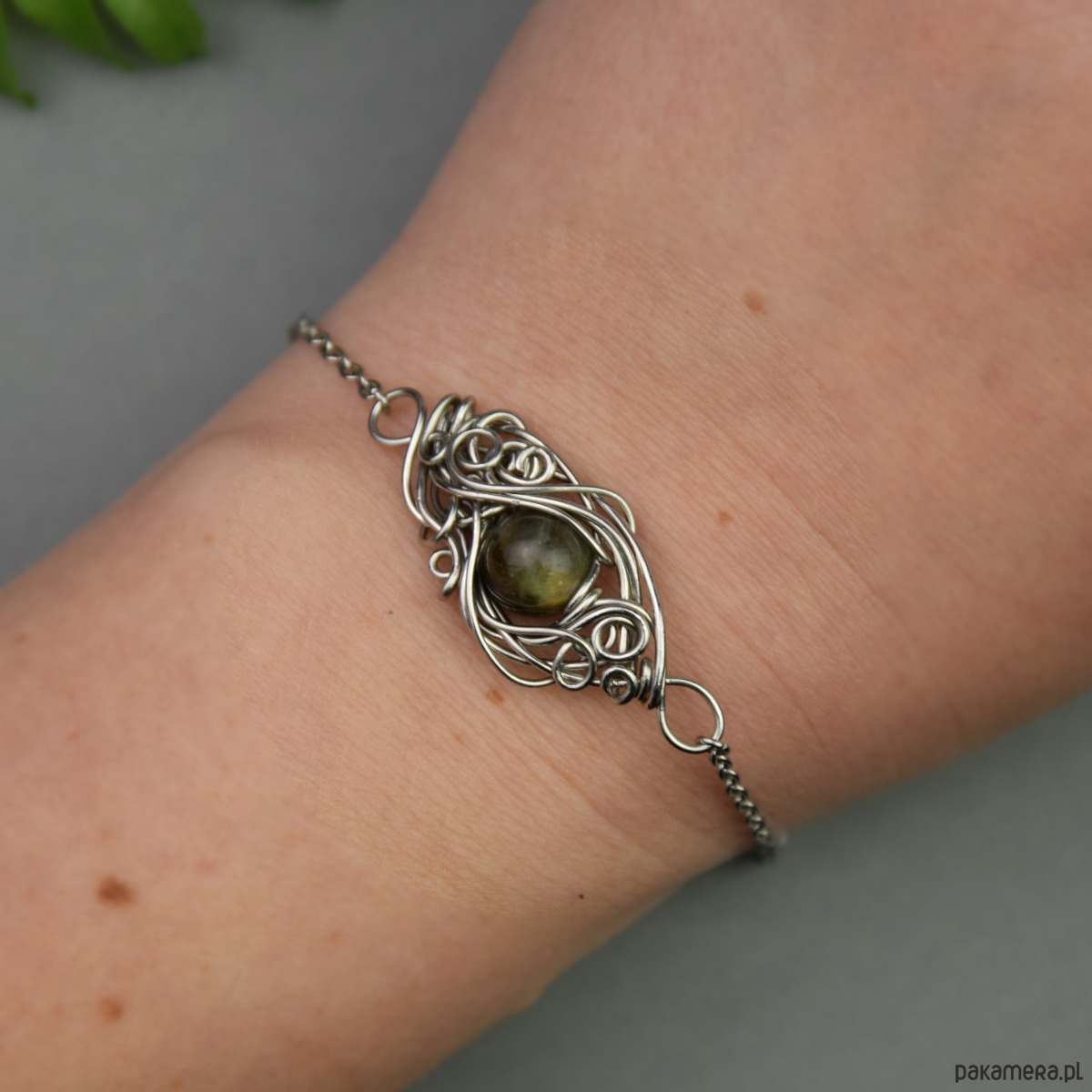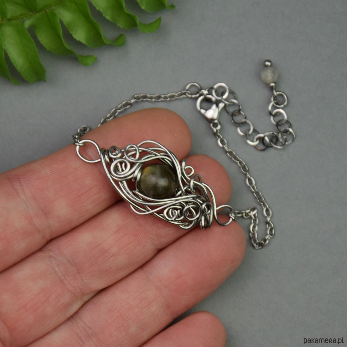 Ręcznie robiona bransoletka z labradorytem, wykonana techniką wire wrapping, w całości ze stali chirurgicznej.