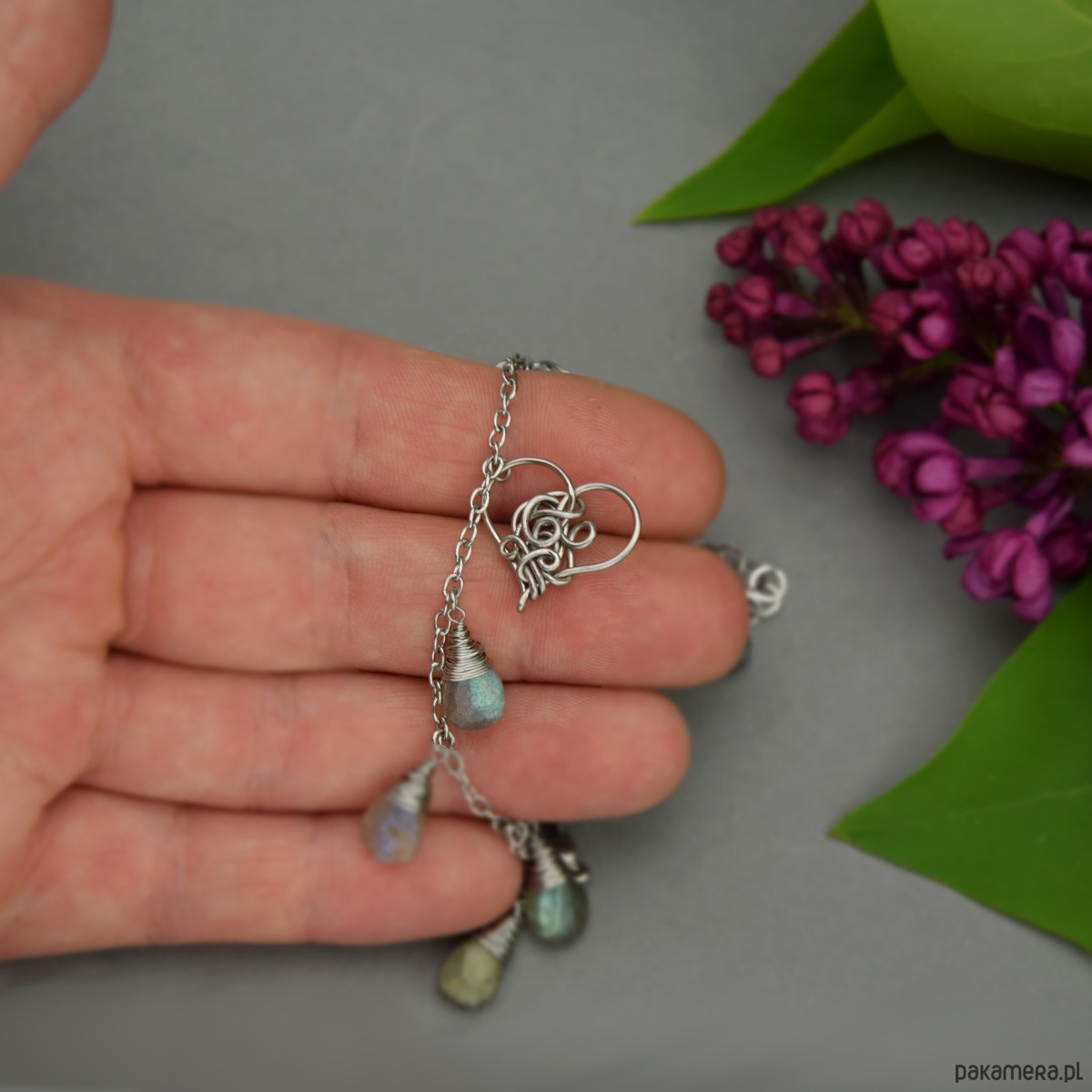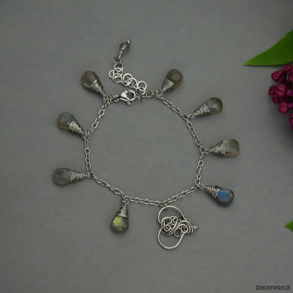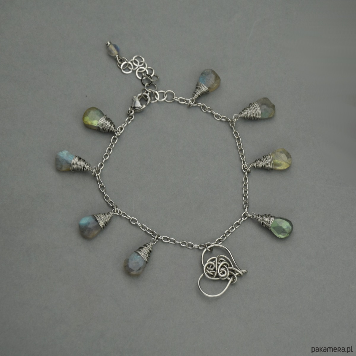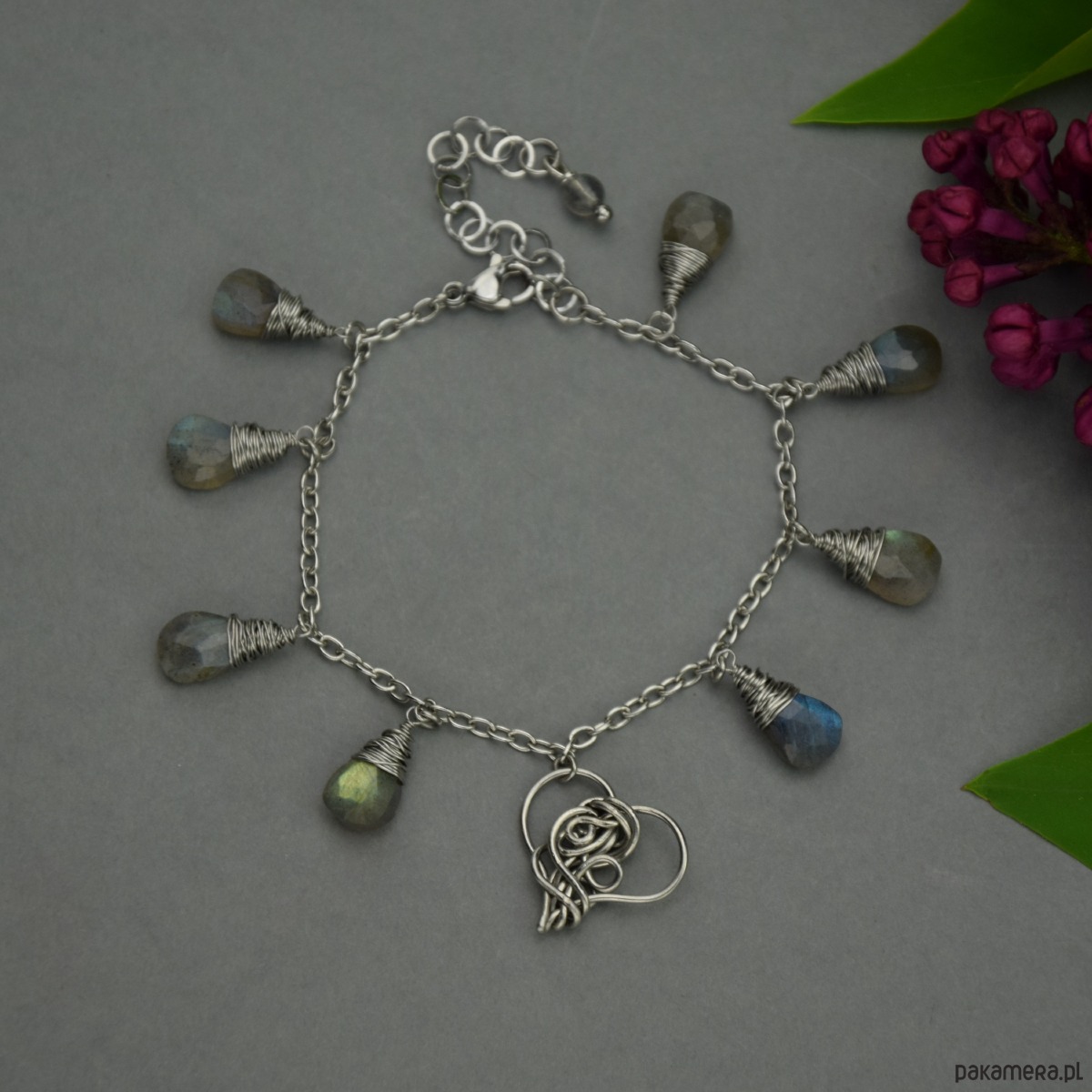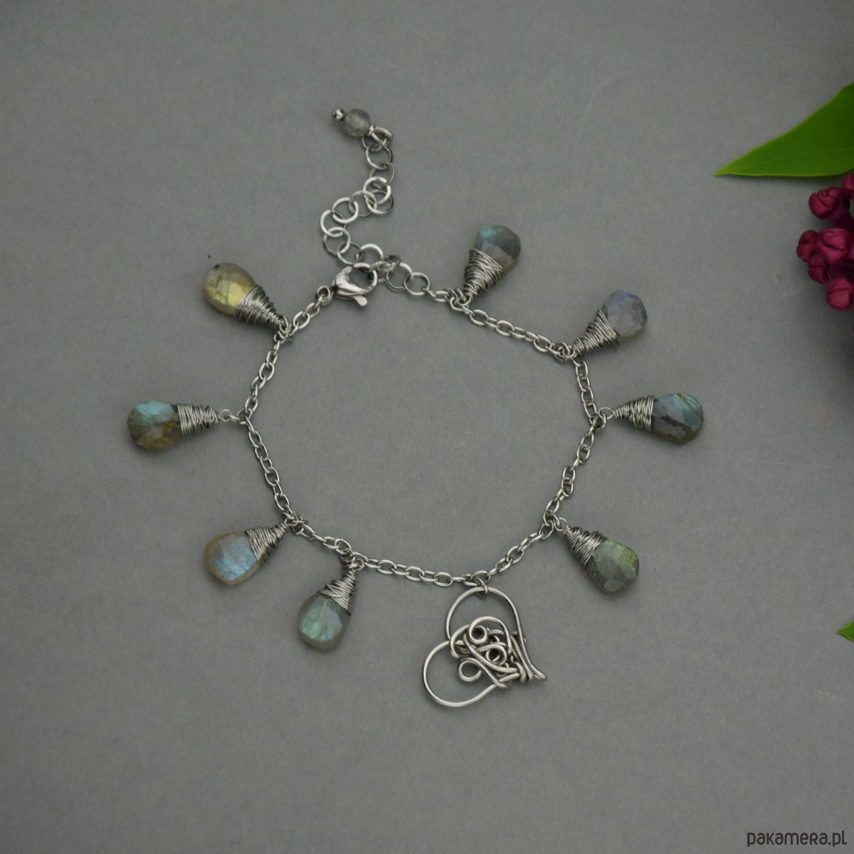 Ręcznie robiona bransoletka z zawieszką w kształcie serca oraz łezkami ślicznie połyskujących, kolorowych labradorytów. Element ozdobny wykonany został techniką wire wrapping. Bransoletka jest w całości ze stali chirurgicznej. Bransoletka wysyłana jest losowo spośród trzech przedstawionych na zdjęciach. Każde serduszko jest inne, unikatowe.