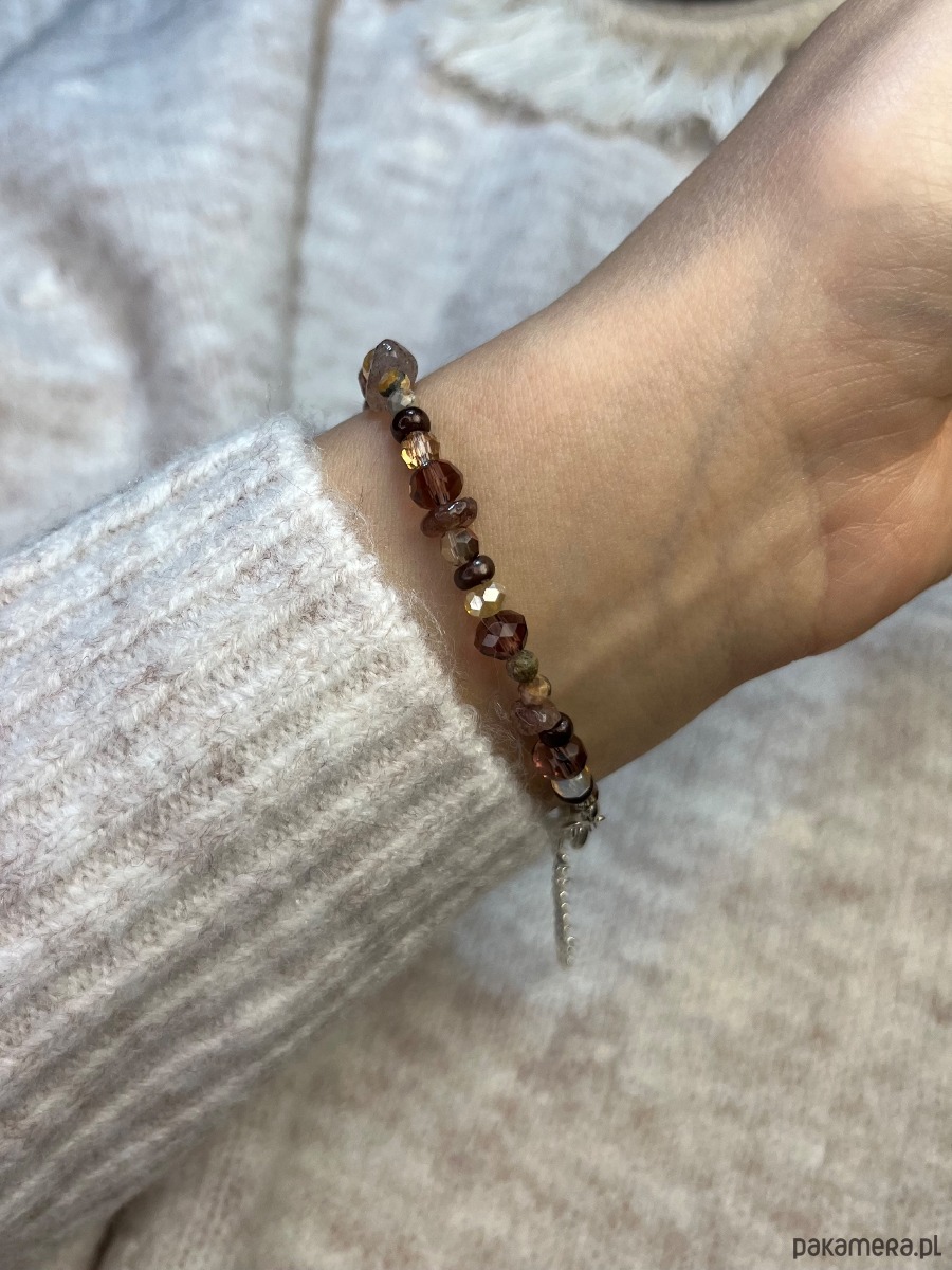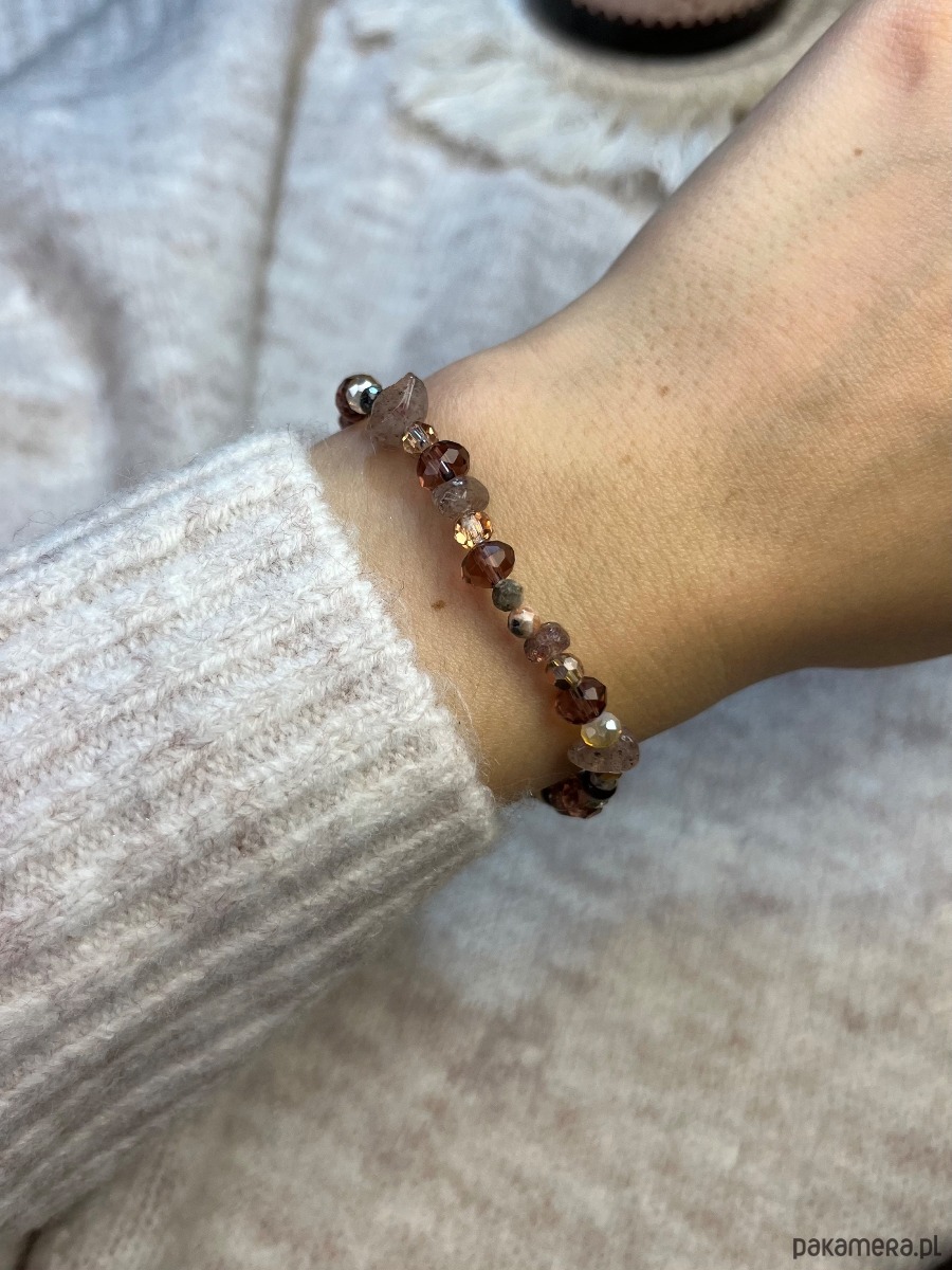 Bransoletka ręcznie wykonana ze szklanych koralików oraz kamieni naturalnych - rodochrozytu i kwarcu.