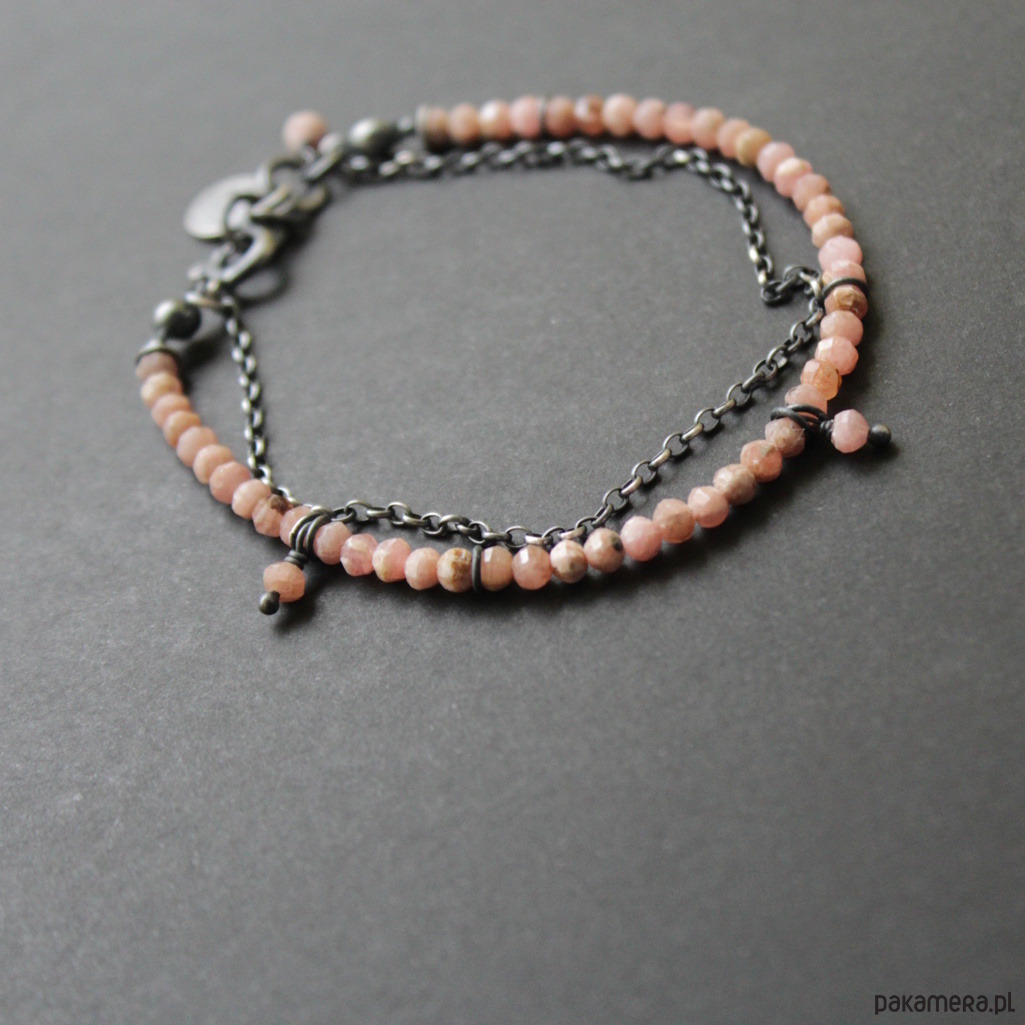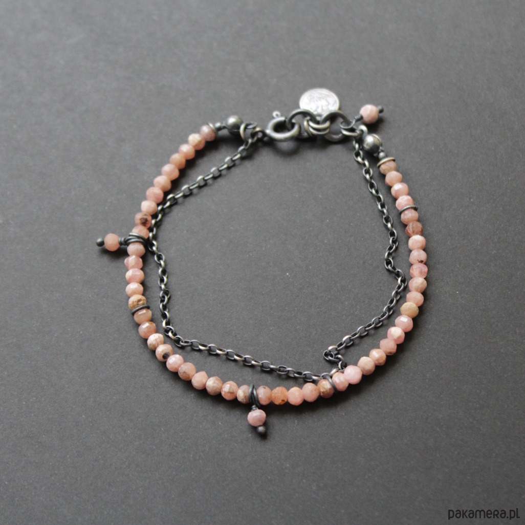 Bransoletka została wykonana z oksydowanego srebra próby 925 oraz fasetowanych rodochrozytów wielkości ,035 cm.