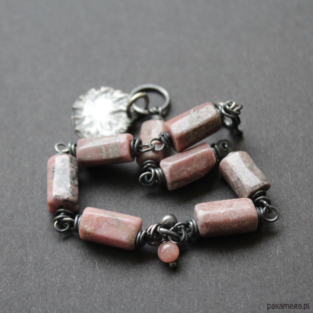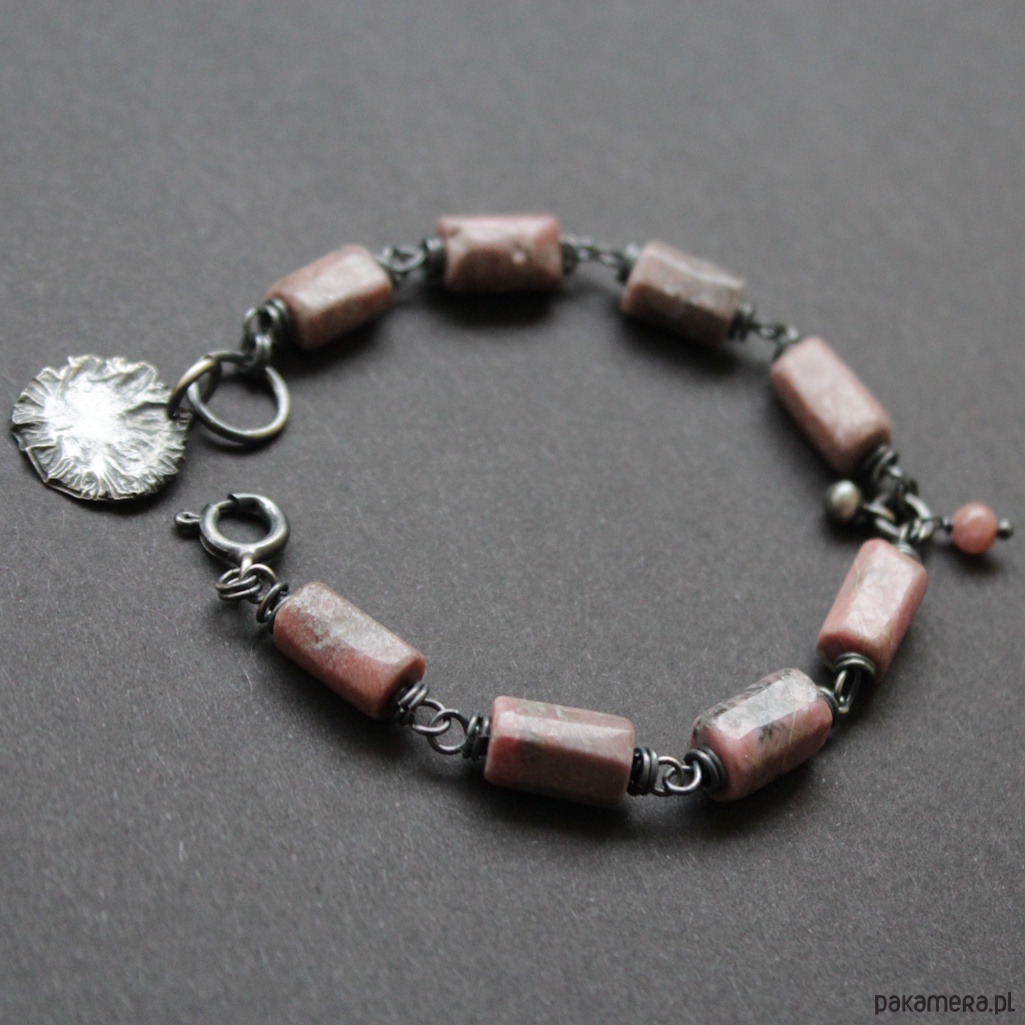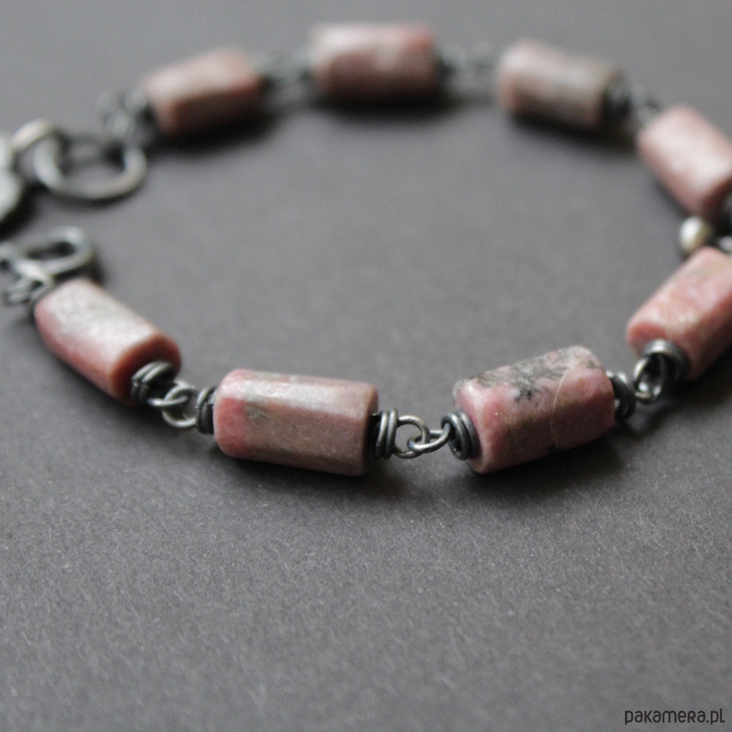 Bransoletka została wykonana z oksydowanego srebra próby 925 oraz bryłek pięknego różowego rodochrozytu wielkości 0,9 - 1,1 cm.