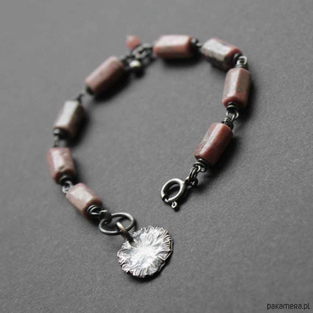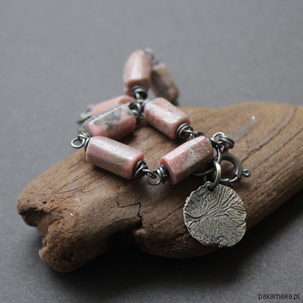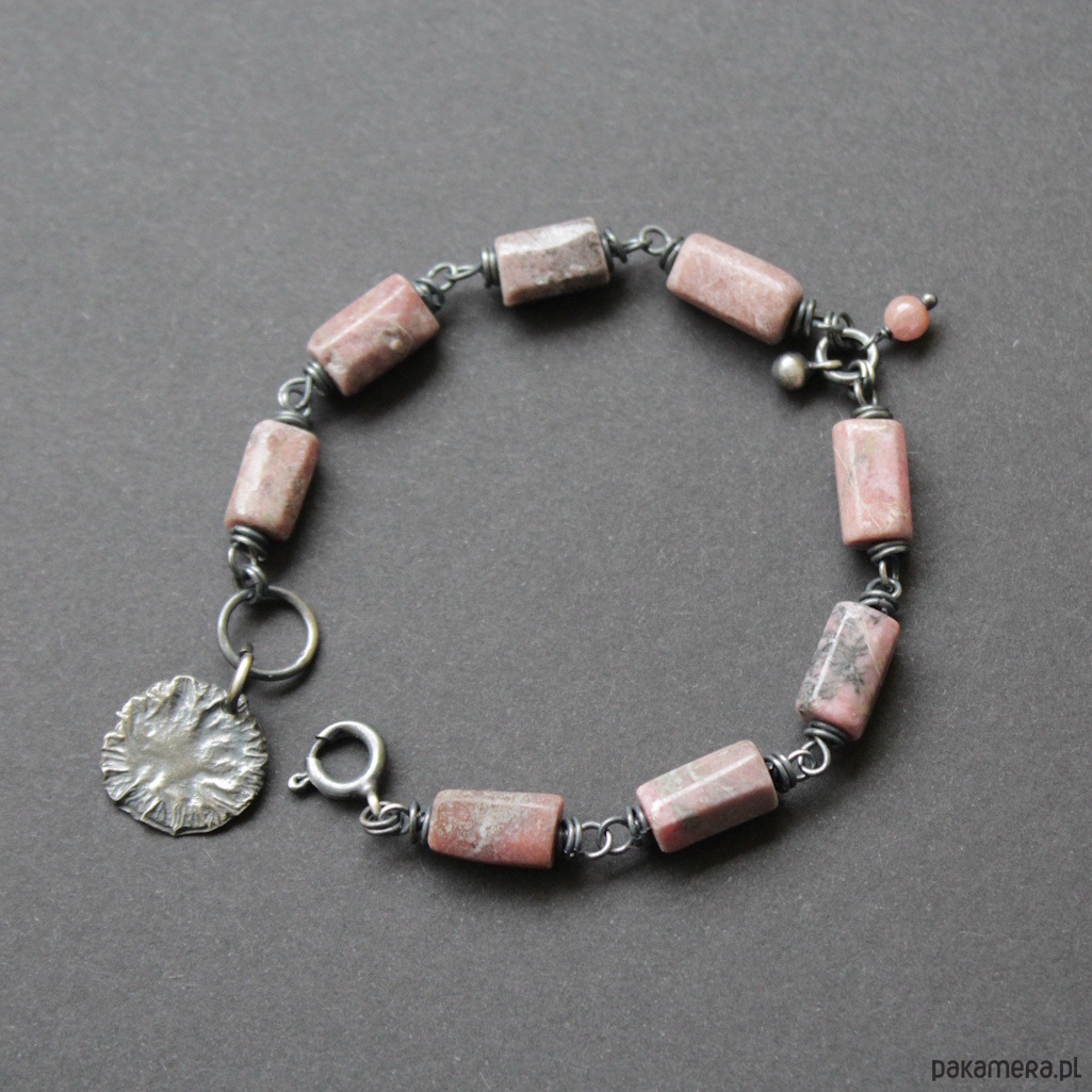 Bransoletka została wykonana z oksydowanego srebra próby 925 oraz bryłek pięknego różowego rodochrozytu wielkości 0,9 - 1,1 cm.