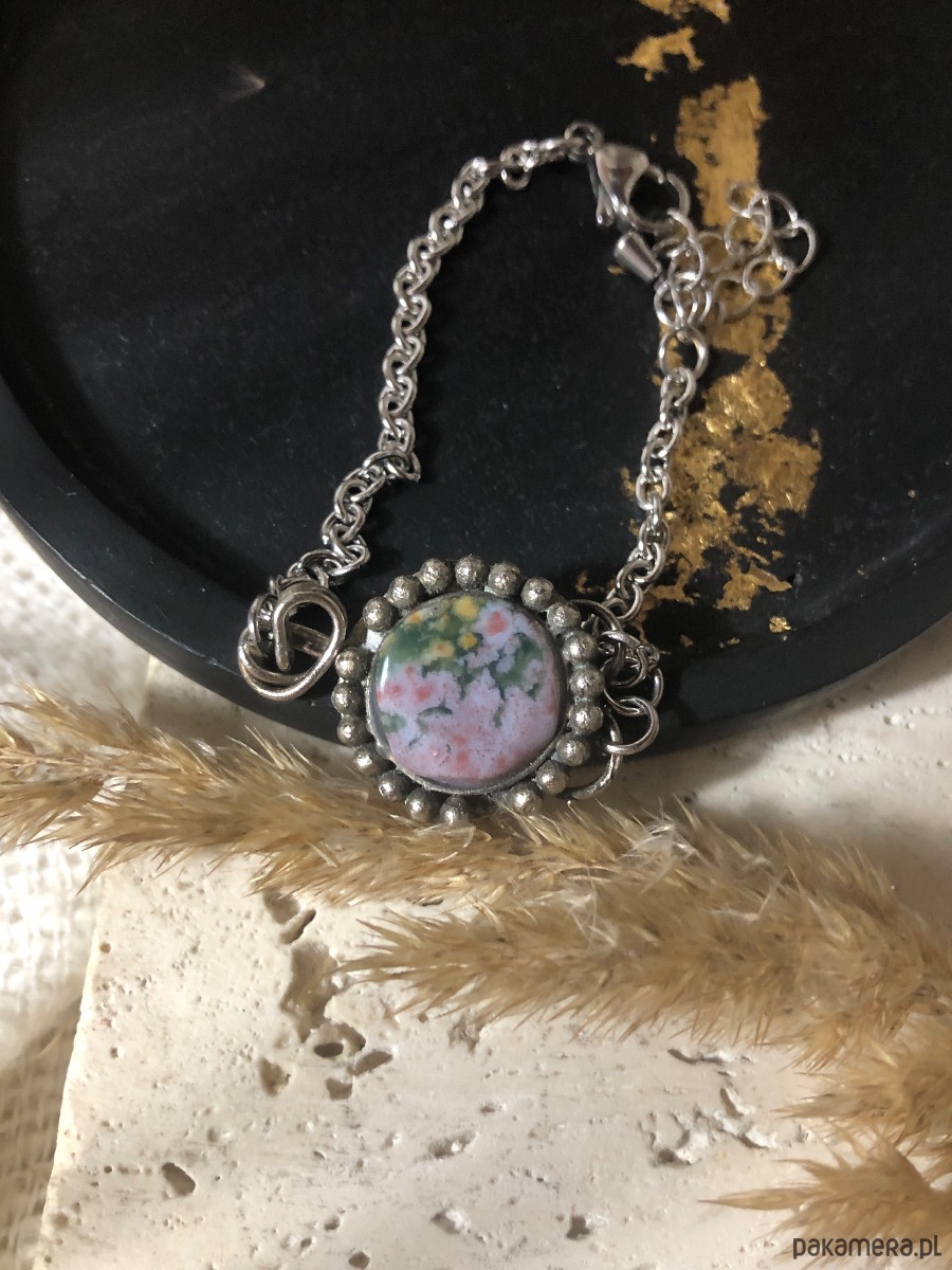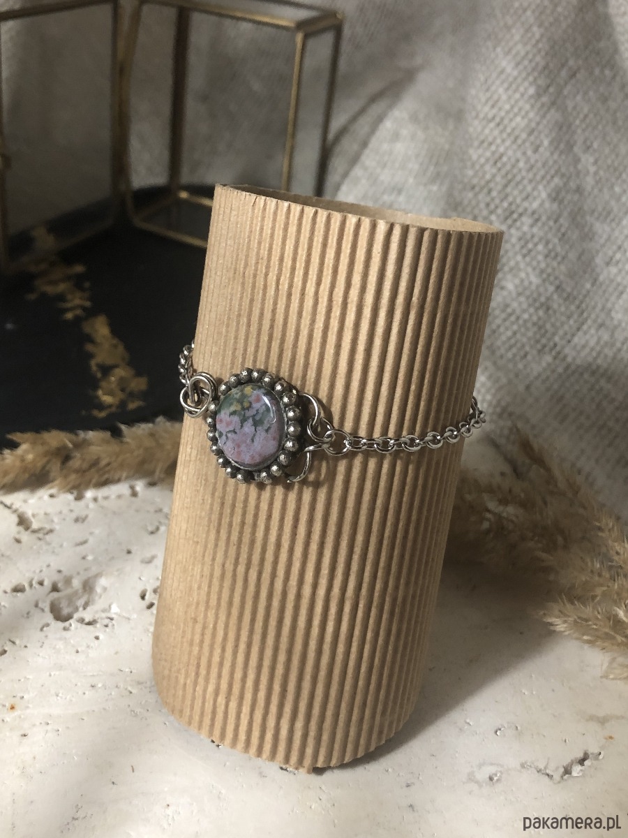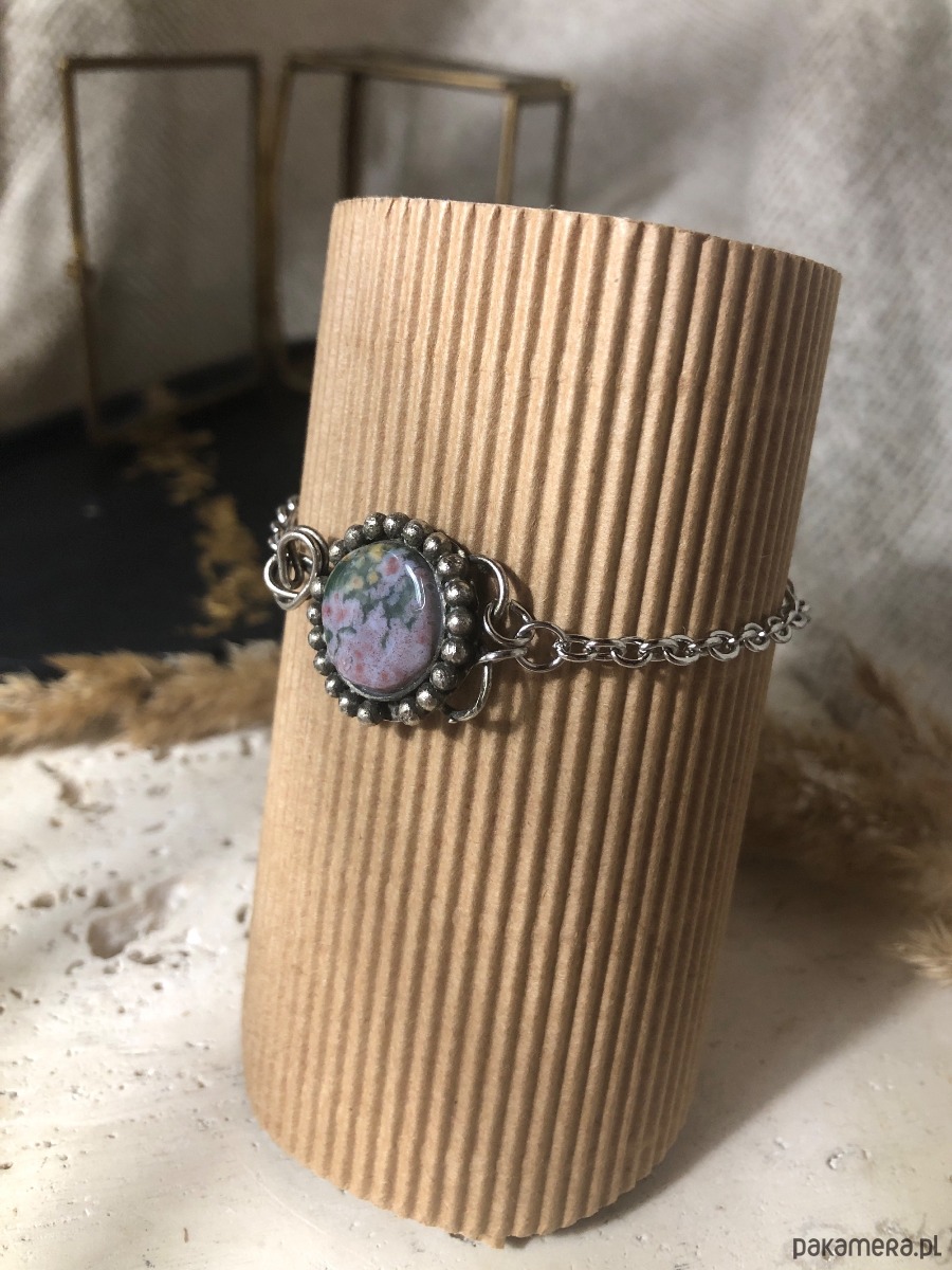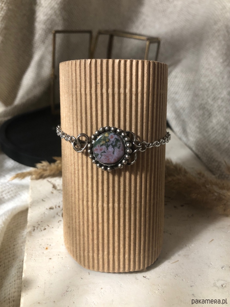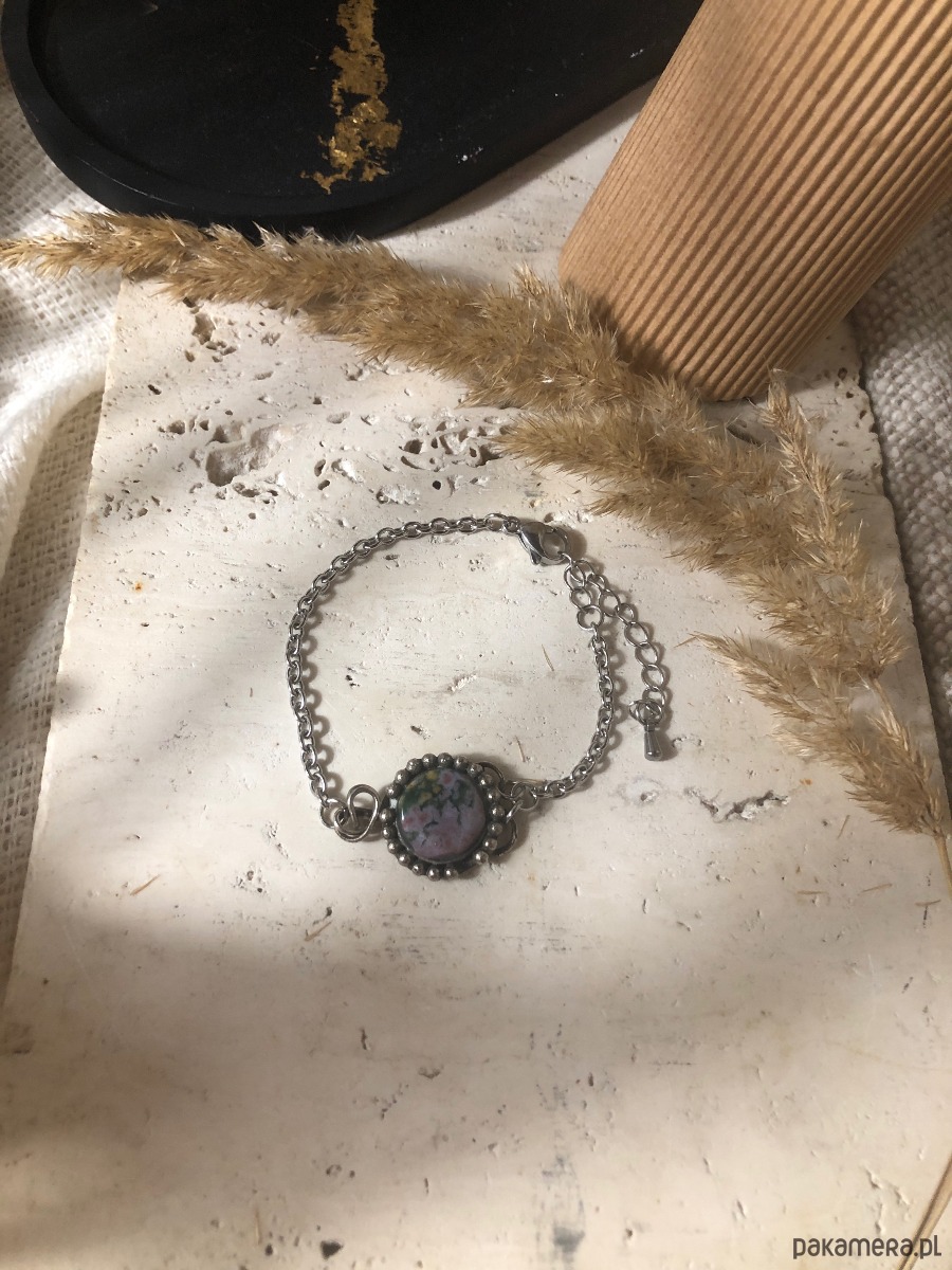 Bransoletka wykonana z kamienia naturalnego i stali chirurgicznej. Metalowy element z kamieniem pochodzi z odzysku ze starej bransolety. Został oczyszczony i ponownie wykorzystany. Bransoletka ma zapięcie typu karabińczyk z przedłużką.