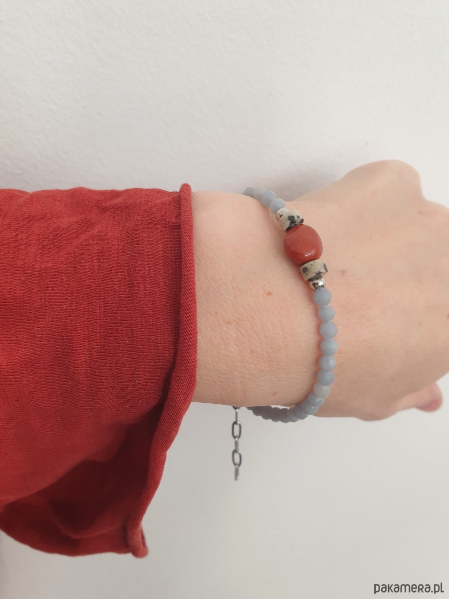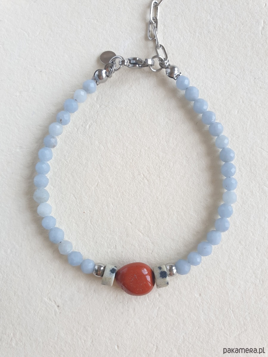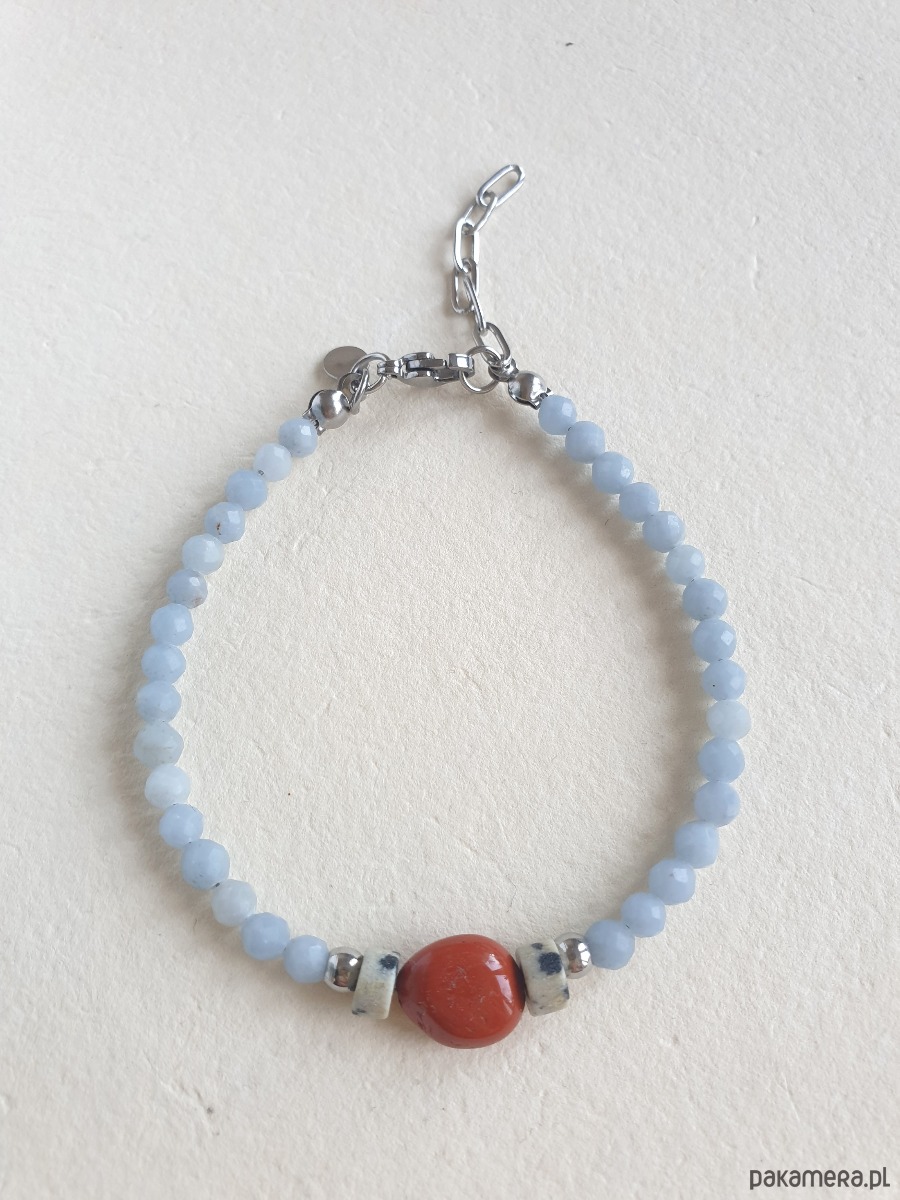 Minimalistyczna delikatna bransoletka z kolekcji ROOTS. Tworzona ręcznie z kamieni naturalnych, elementów ze stali szlachetnej (antyalergicznej) i kamieni naturalnych. W tej - angelit, jaspis królewski czerwony, jaspis dalmatyński