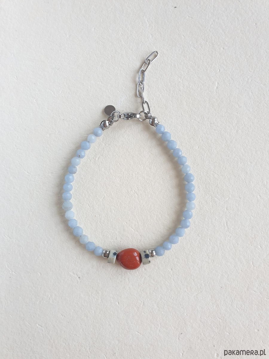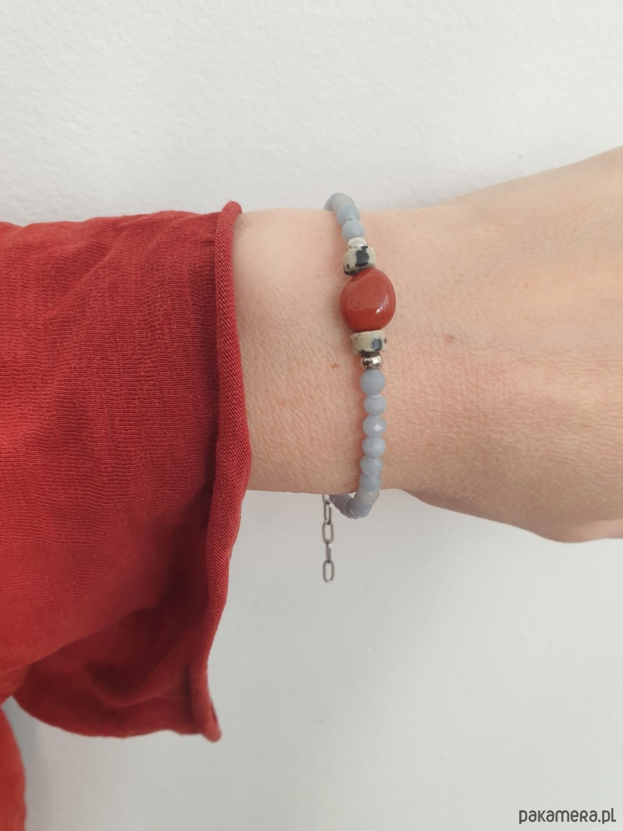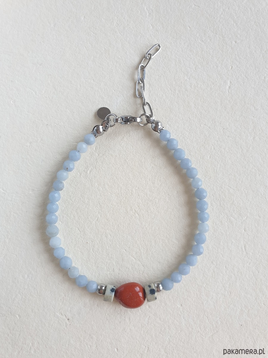 Minimalistyczna delikatna bransoletka z kolekcji ROOTS. Tworzona ręcznie z kamieni naturalnych, elementów ze stali szlachetnej (antyalergicznej) i kamieni naturalnych. W tej - angelit, jaspis królewski czerwony, jaspis dalmatyński