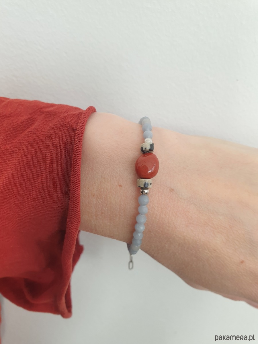 Minimalistyczna delikatna bransoletka z kolekcji ROOTS. Tworzona ręcznie z kamieni naturalnych, elementów ze stali szlachetnej (antyalergicznej) i kamieni naturalnych. W tej - angelit, jaspis królewski czerwony, jaspis dalmatyński