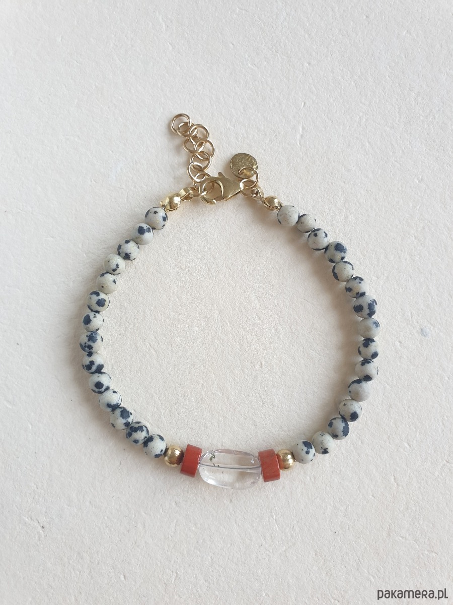 Minimalistyczna delikatna bransoletka ROOTS. Tworzona ręcznie z kamieni naturalnych, elementów ze stali szlachetnej pozłacanej i kamieni naturalnych. W tej - jaspis dalmatyński, kryształ górski, jaspis czerwony
