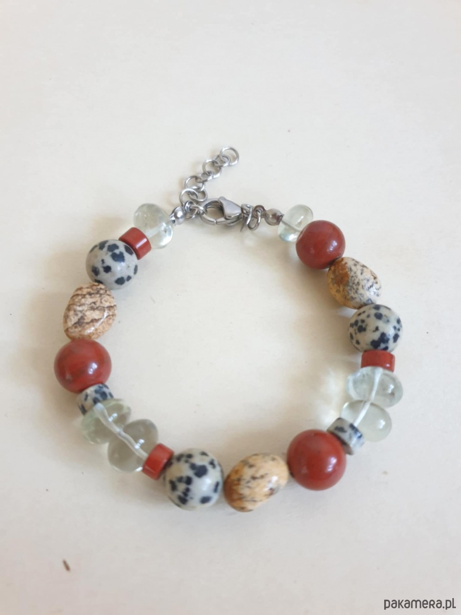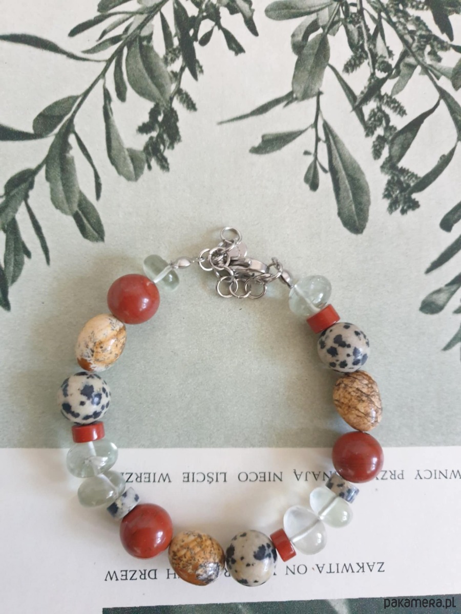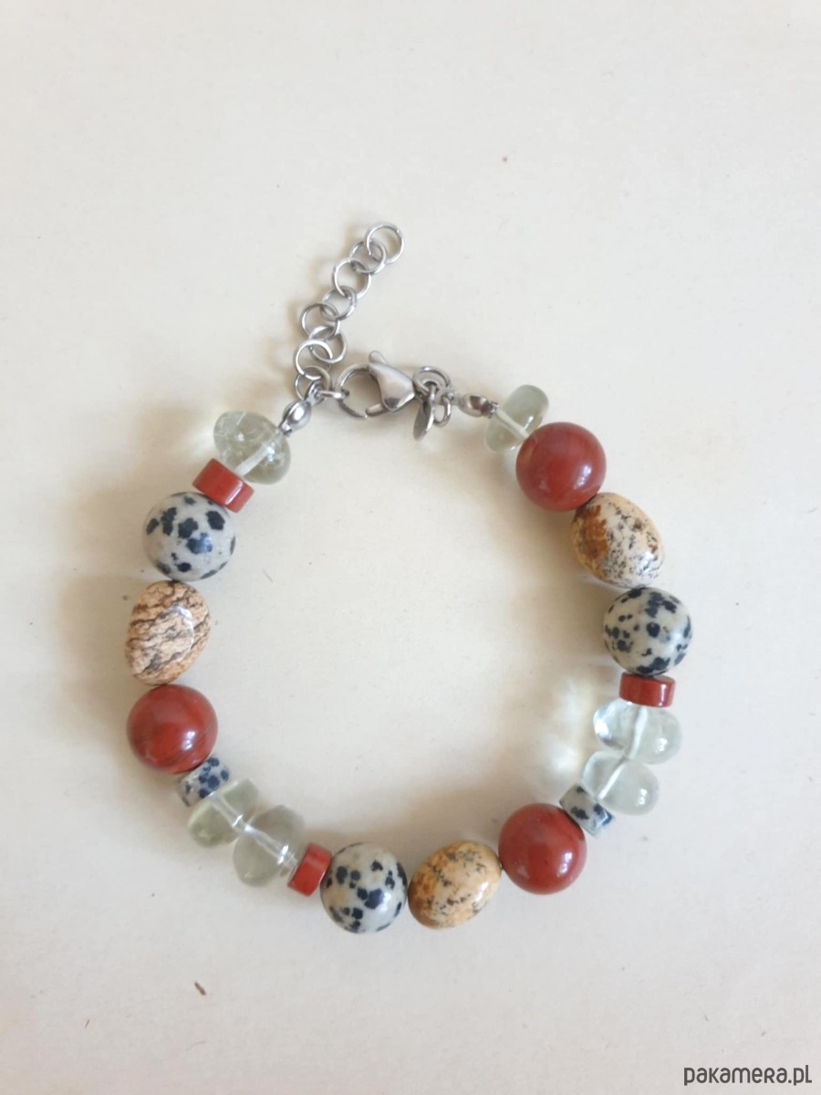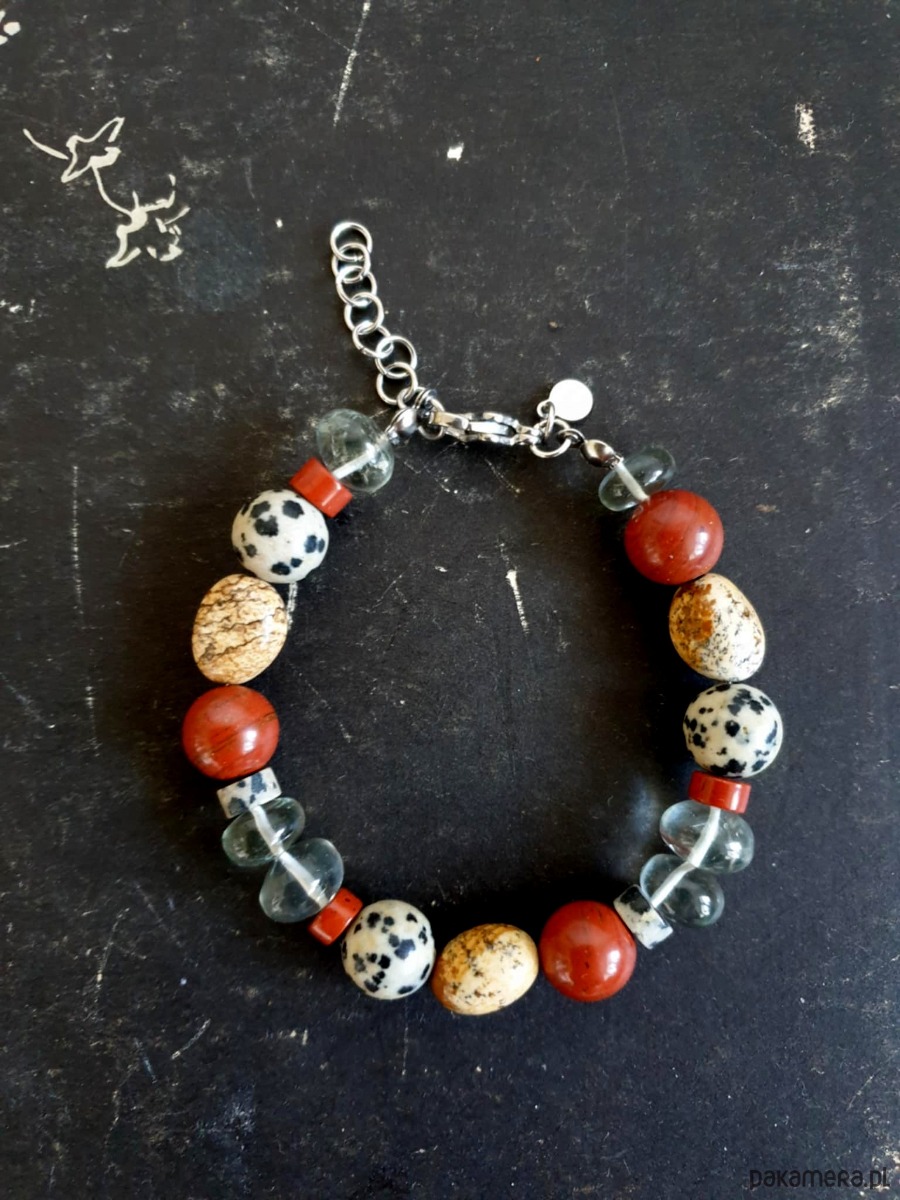 Bransoletka z kolekcji ROOTS z dużymi kamieniami. Tworzona ręcznie z kamieni naturalnych- prasiolit, jaspis czerwony, jaspis dalmatyński, jaspis obrazkowy. Elementy ze stali szlachetnej (antyalergicznej) Bransoletka w stylu boho.