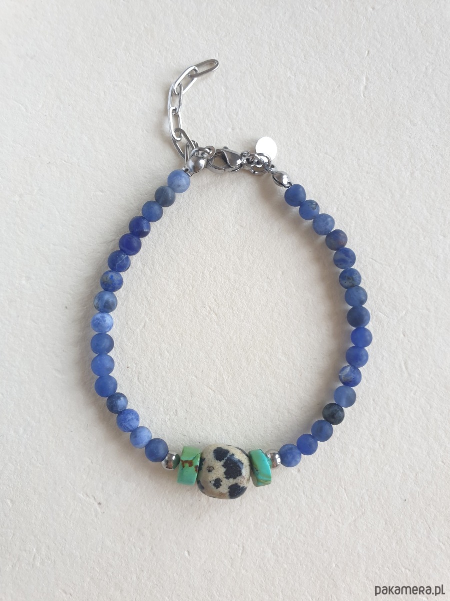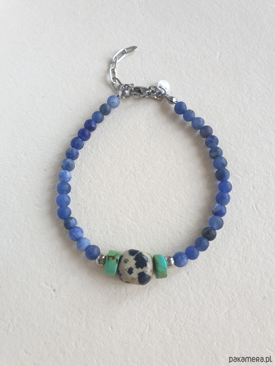 Minimalistyczna delikatna bransoletka z kolekcji ROOTS. Tworzona ręcznie z kamieni naturalnych, elementów ze stali szlachetnej (antyalergicznej) i kamieni naturalnych. W tej - sodalit, turkus, jaspis dalmatyński