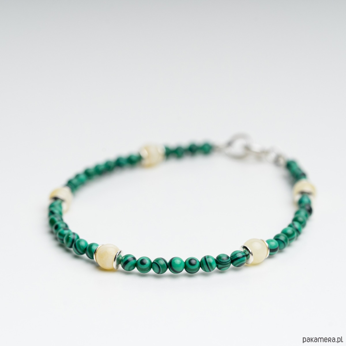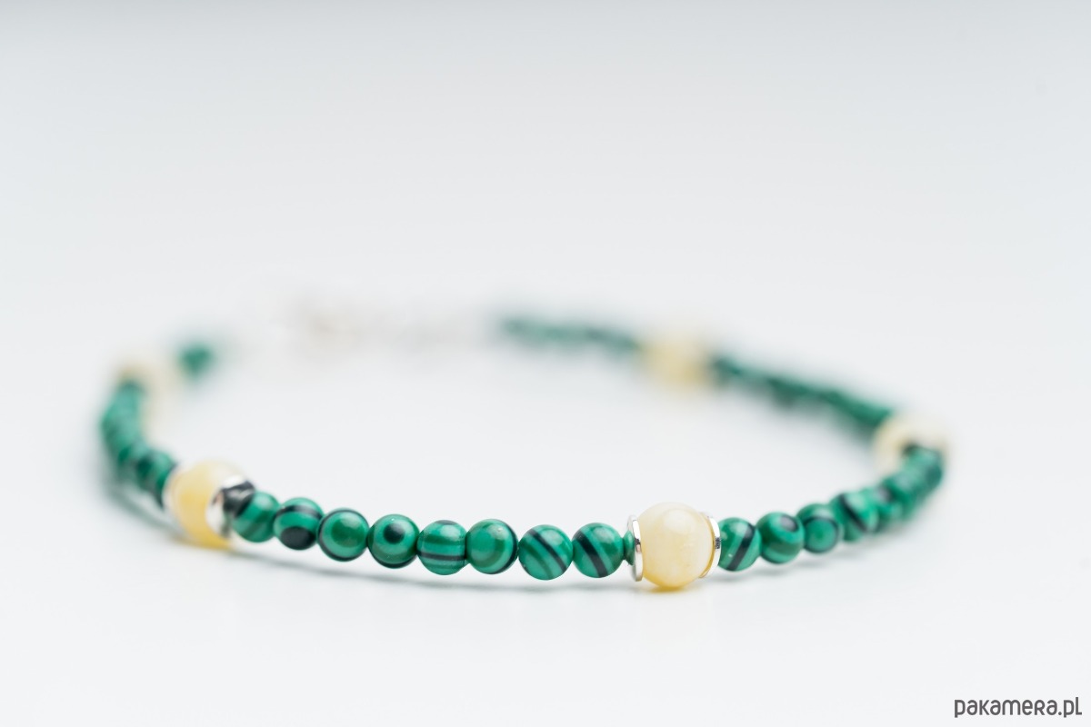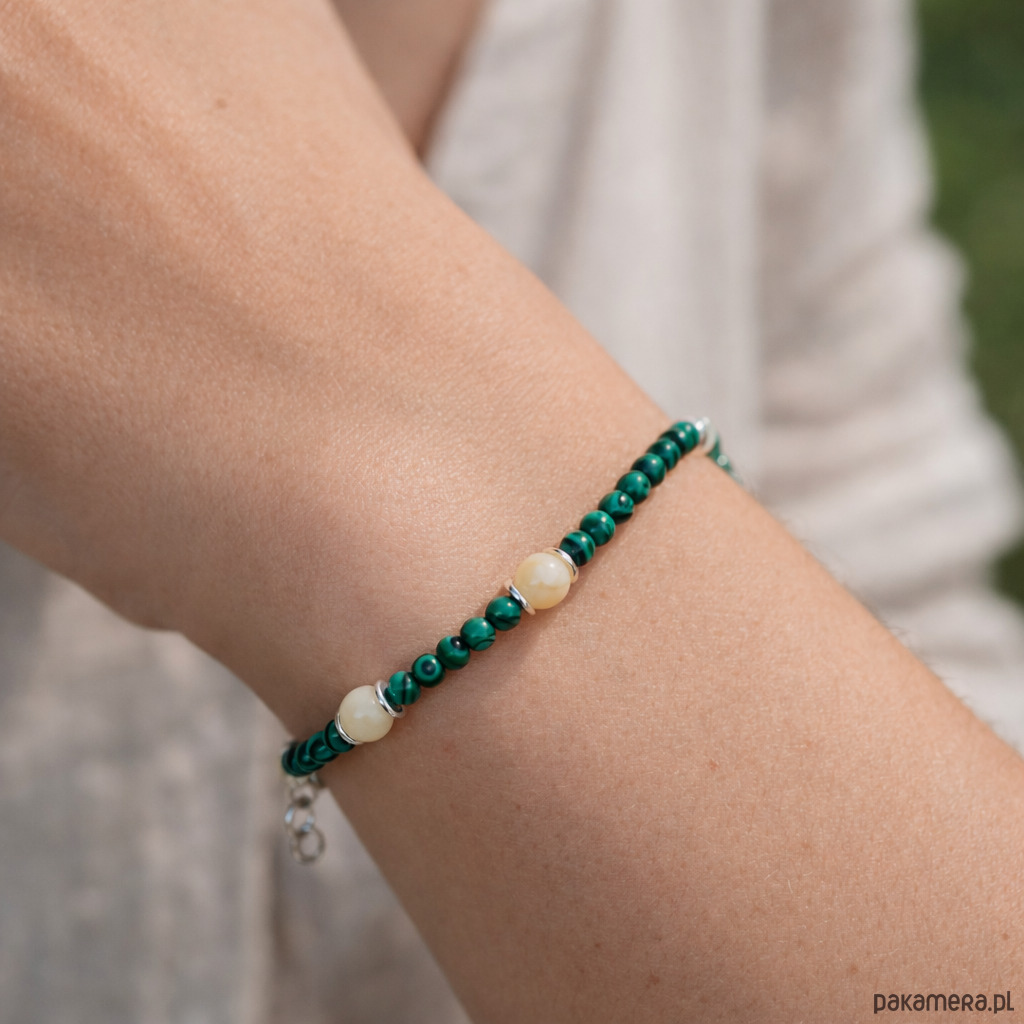 Naturalna bransoletka z mlecznego bursztynu bałtyckiego i malachitu, wykończona elementami ze srebra próby 925. Minimalistyczna, a jednocześnie wyrazista, łączy ciepło naturalnego bursztynu z głęboką zielenią malachitu o charakterystycznym, pasmowym rysunku.