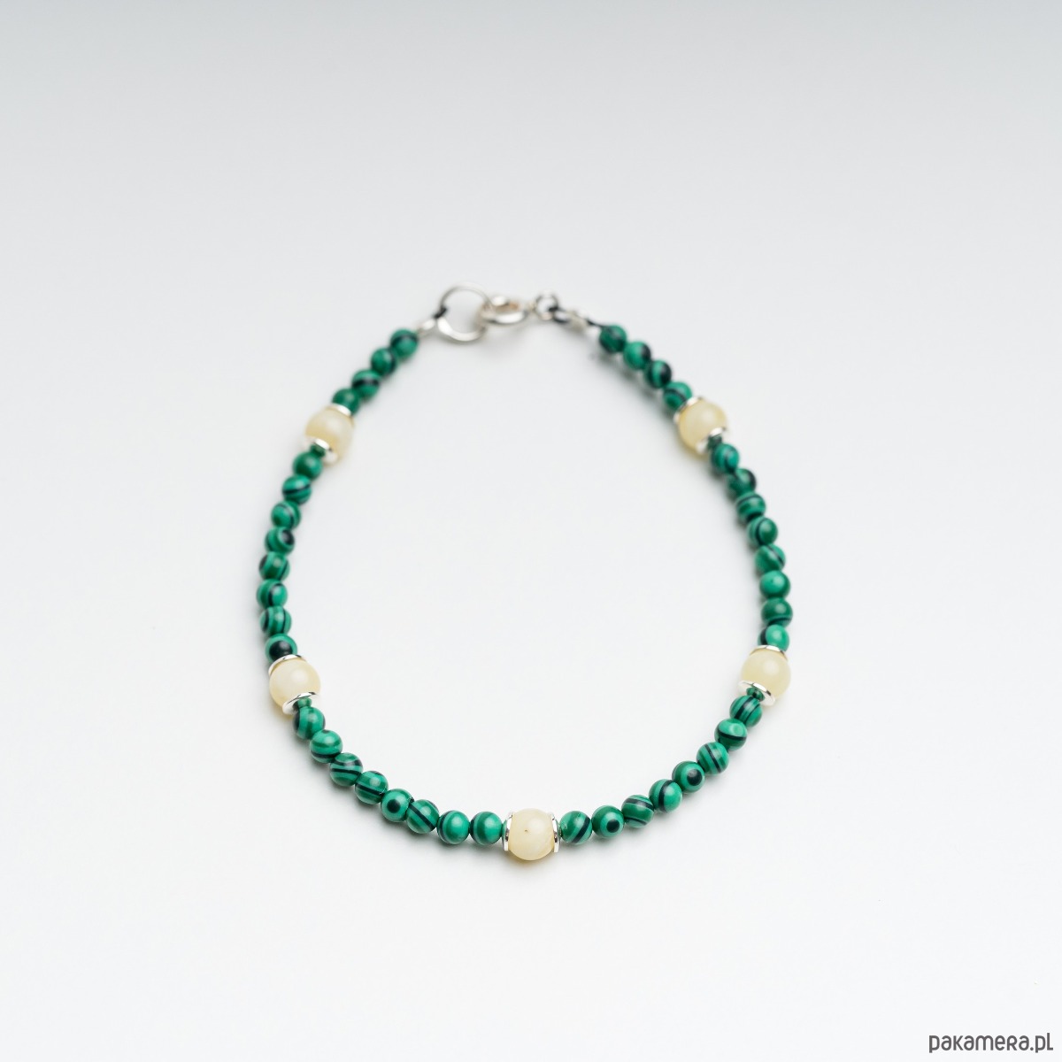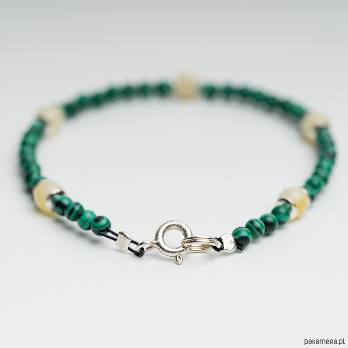 Bransoletka z mlecznego bursztynu bałtyckiego i malachitu – srebro 925