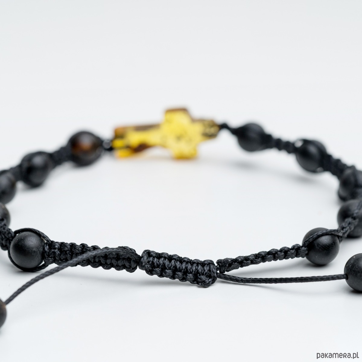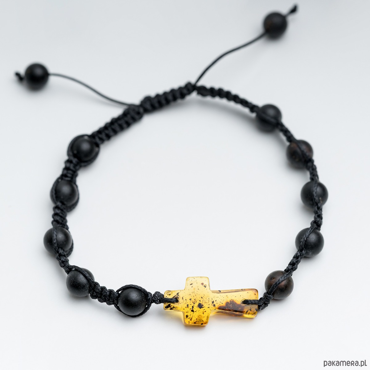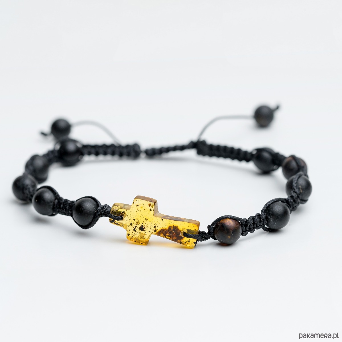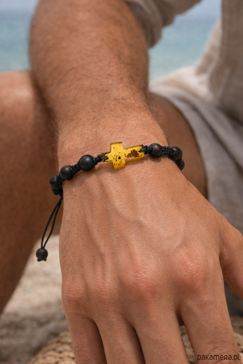 Minimalistyczna bransoletka męska wykonana z naturalnego bursztynu bałtyckiego w czarnym kolorze. Bursztynowe koraliki w kształcie kulki tworzą spójną, elegancką kompozycję. Bursztynowy krzyżyk w kolorze cytryny kontrastuje z czarnym kolorem bursztynów.