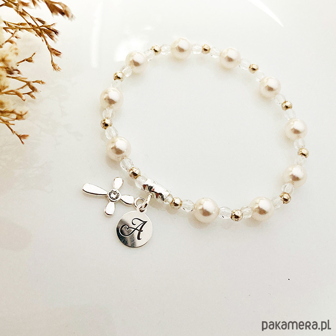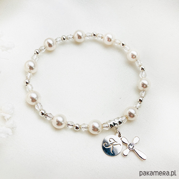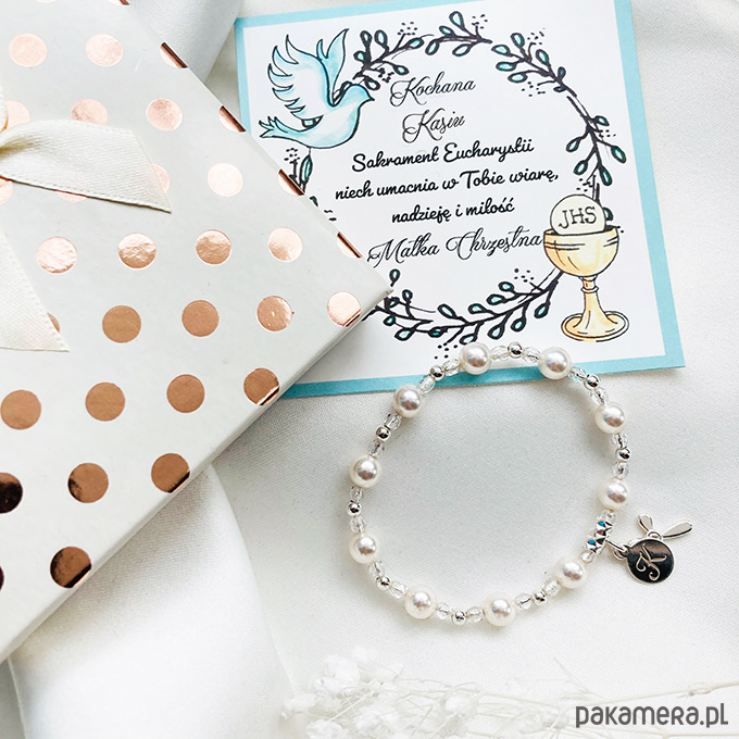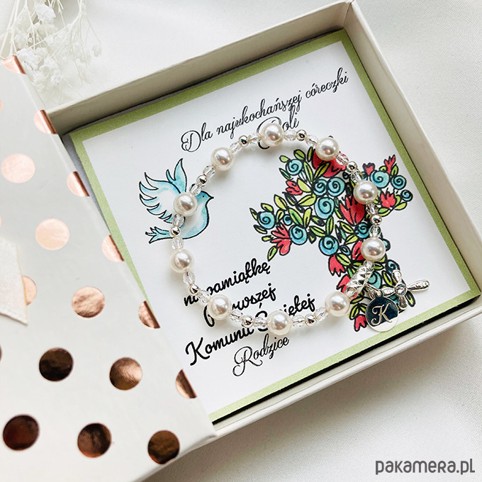 Wyjątkowy unikalny prezent z okazji Pierwszej Komunii lub Chrztu. Zawiera piękny różaniec bransoletkę z pereł GAVBARI PEARLS z wybranym inicjałem i krzyżykiem ze srebra 925 oraz opcjonalnie wykonaną ręcznie kartę z życzeniami.