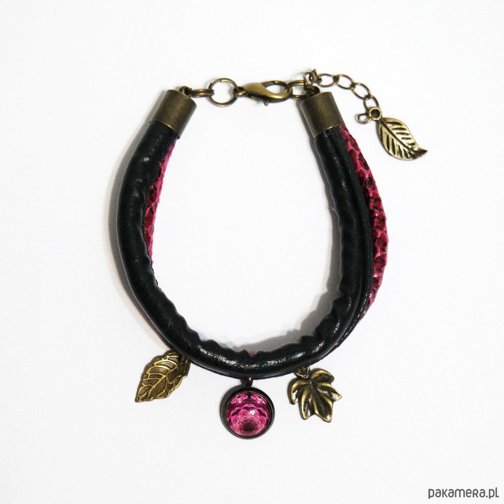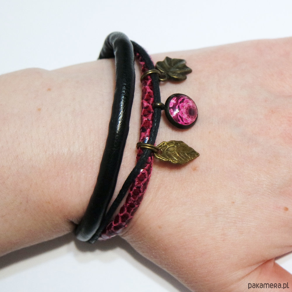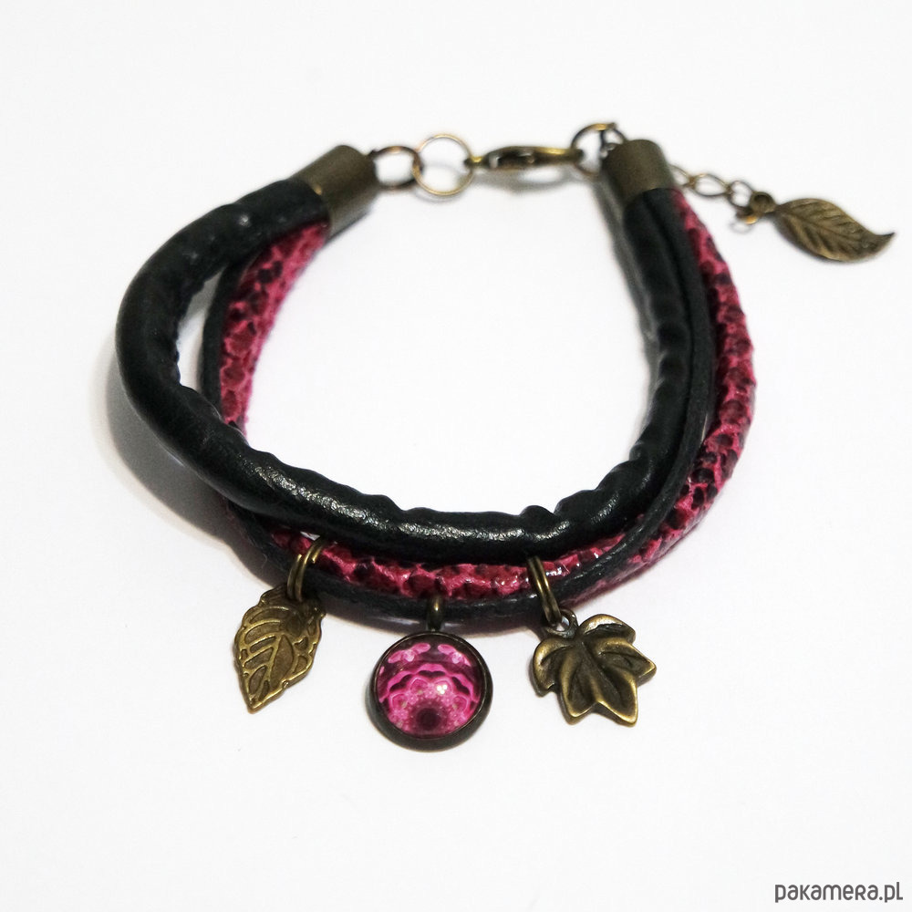 Bransoletka wykonana jest z rzemieni z eko-skóry, sznurków ora zawieszek.