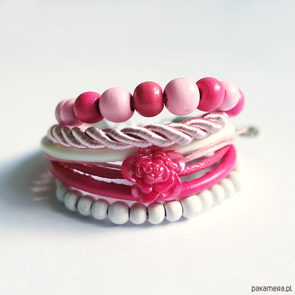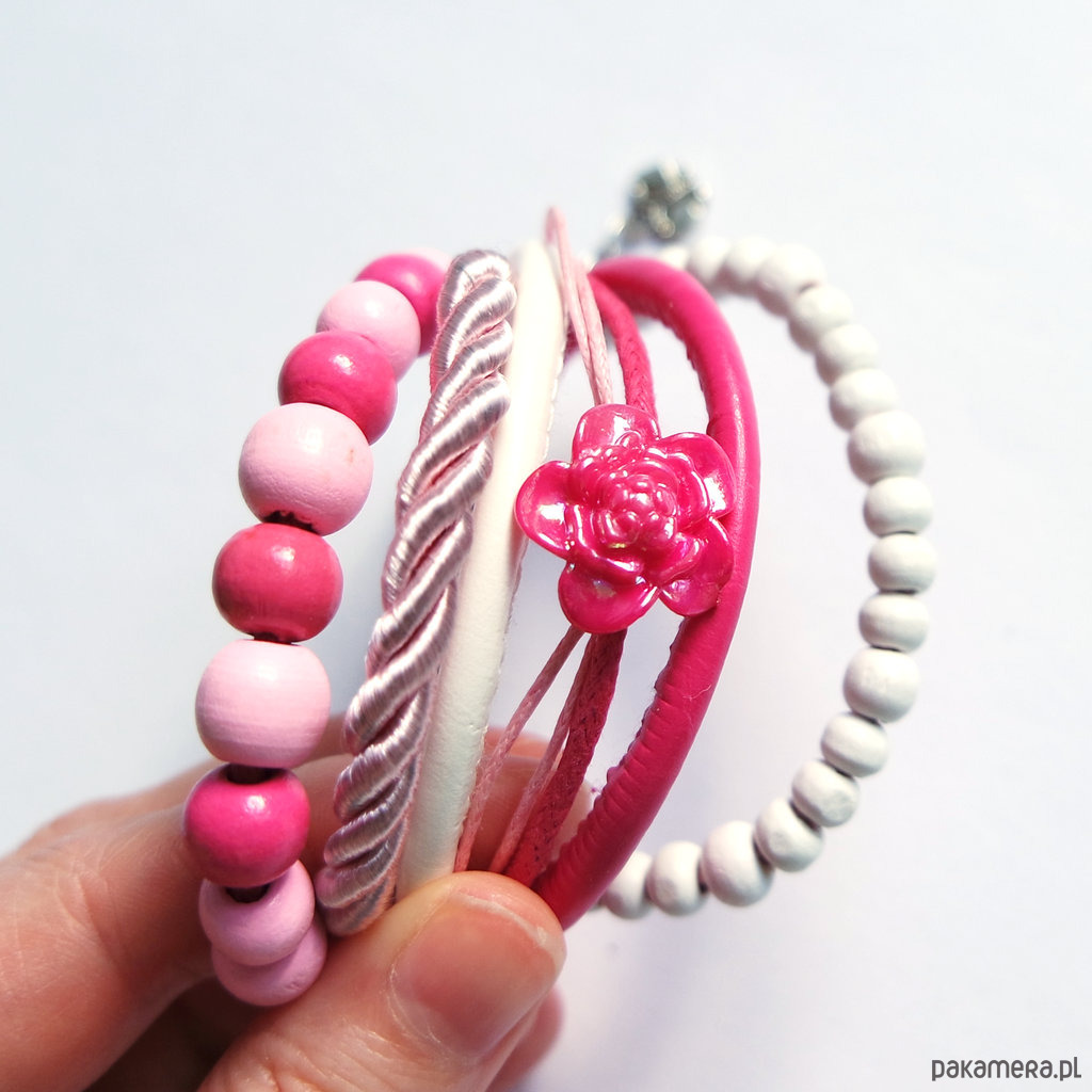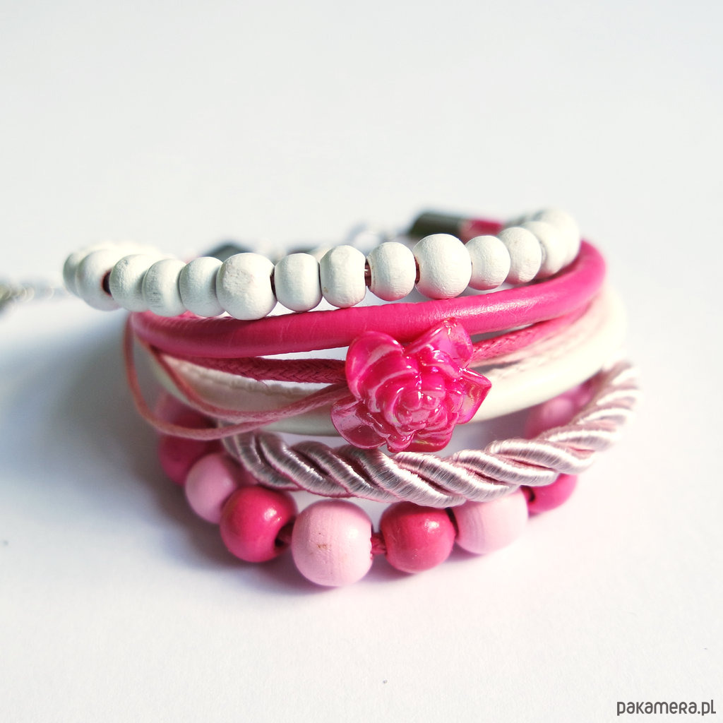 Bransoletka - Różowa róża - rzemienie, drewniane koraliki