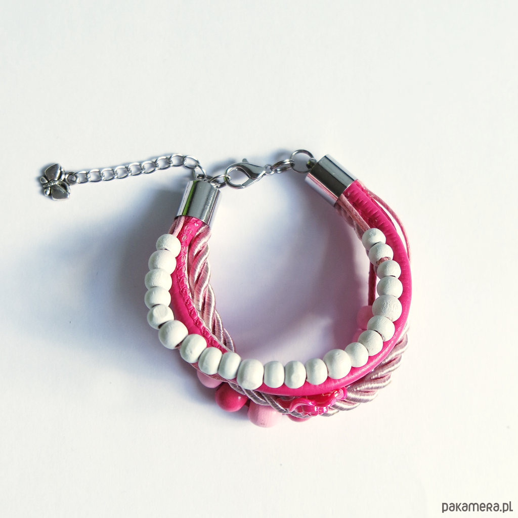 Bransoletka zrobiona jest z rzemieni ze skóry ekologicznej, sznurka oraz drewnianych i akrylowych koralików.