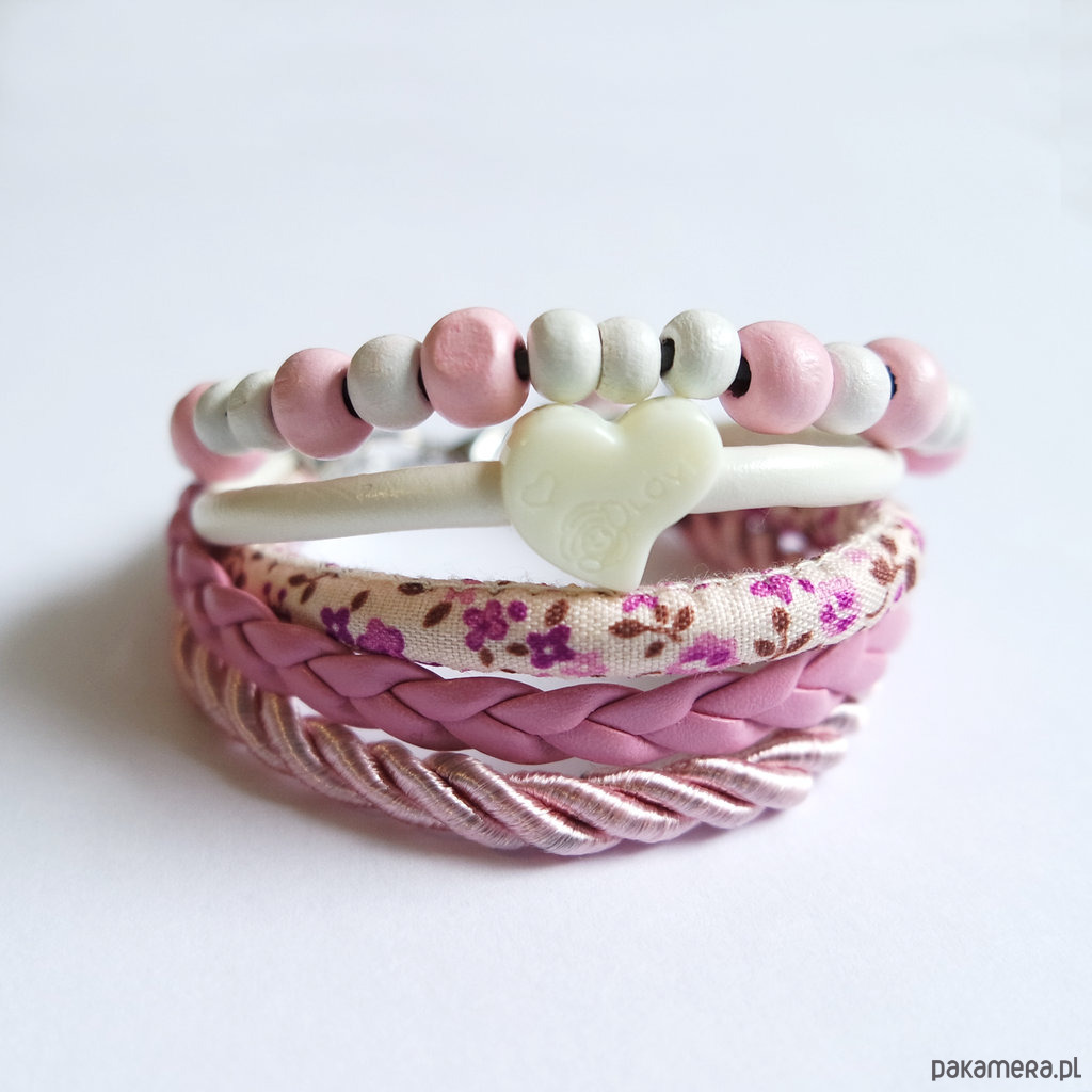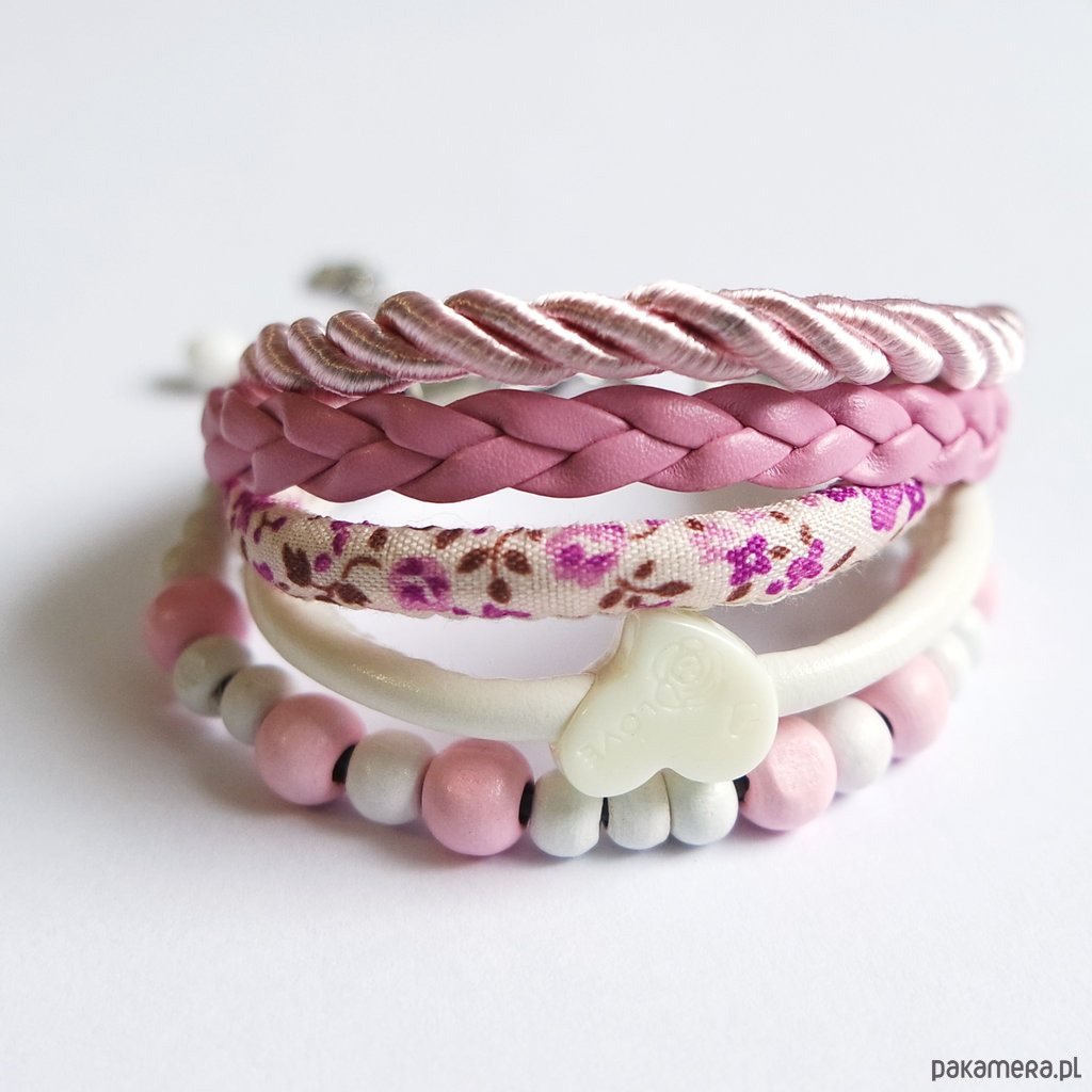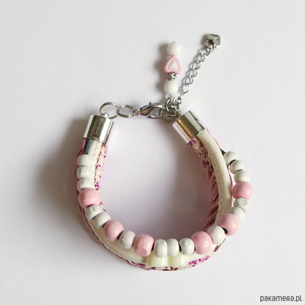 Bransoletka - Różowa, serce - rzemienie, drewniane koraliki