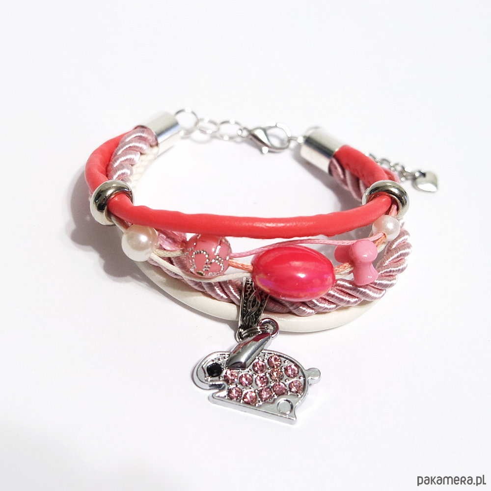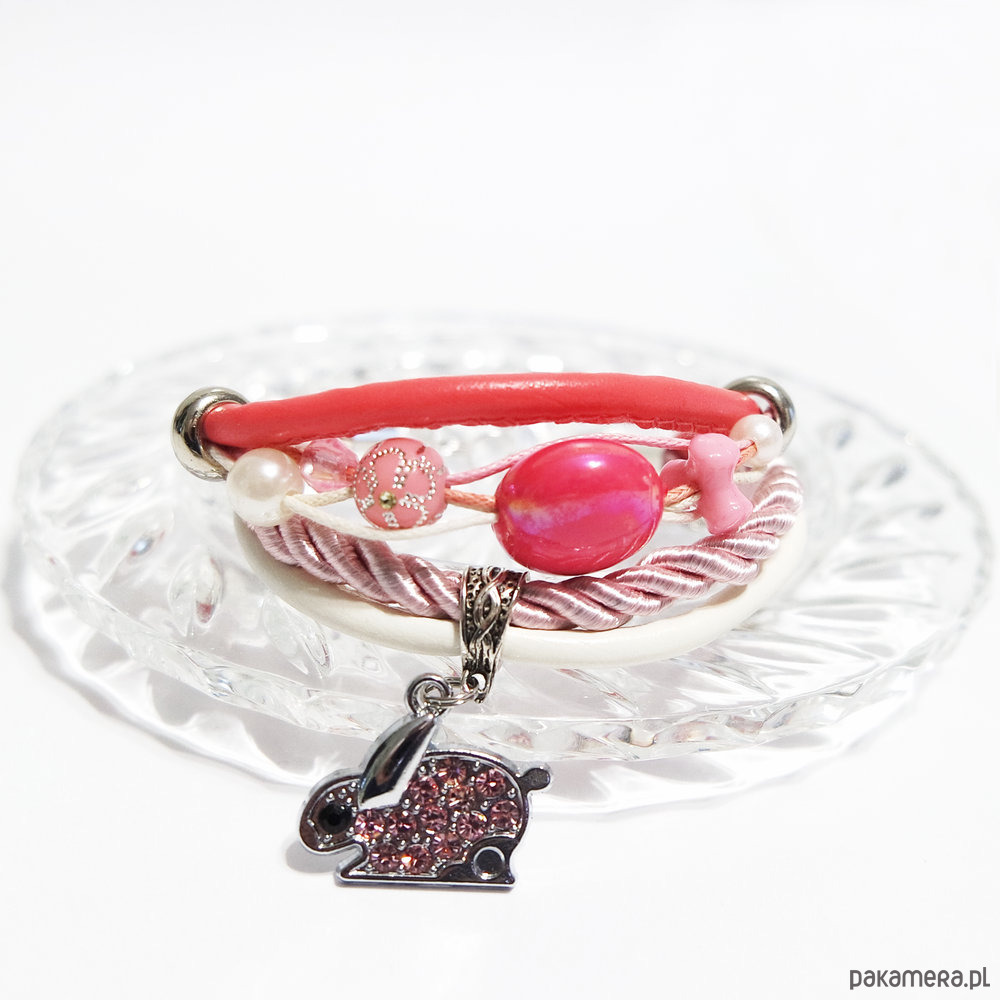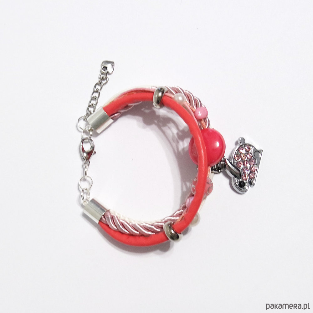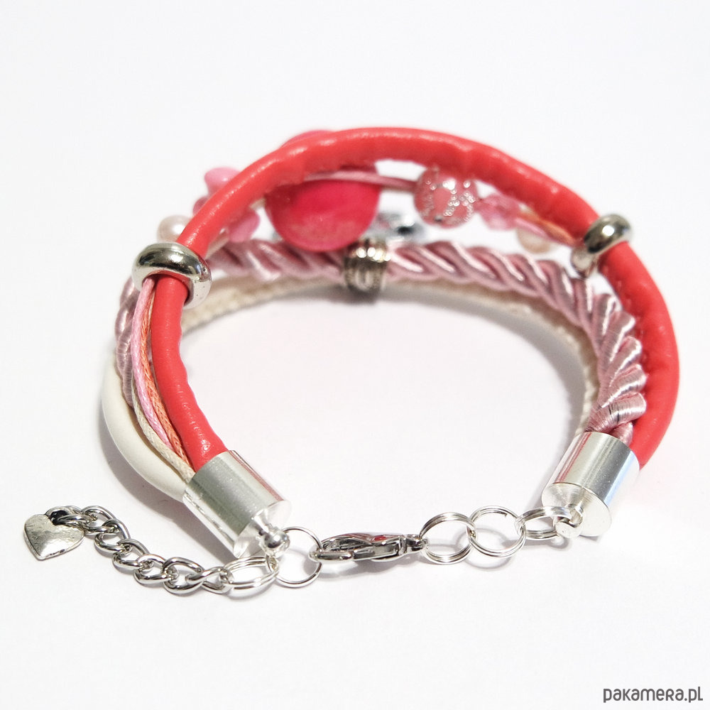 Bransoletka zrobiona jest z rzemieni z eko-skóry, sznurka, koralików oraz przekładek i zawieszki.
