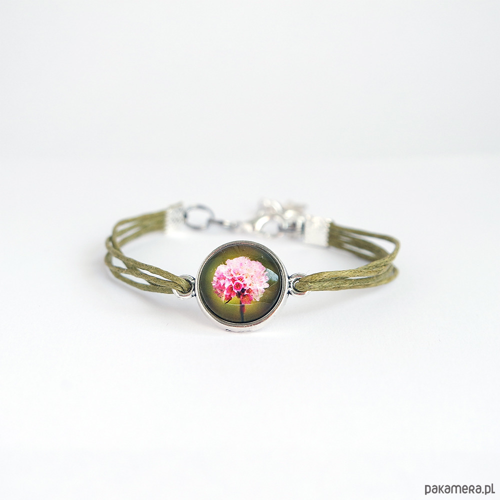 Bransoletka - Różowy kwiat - zielona, sznurki