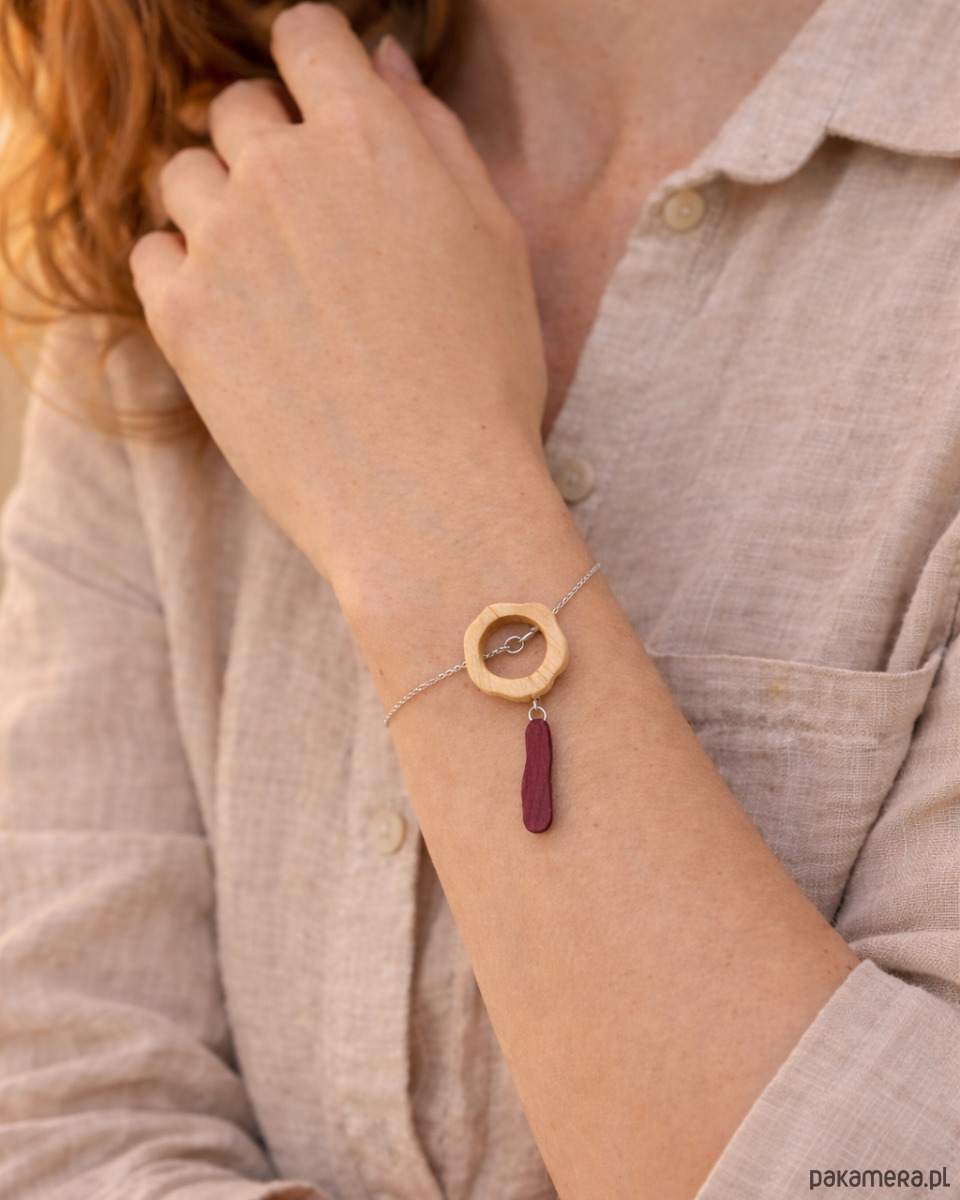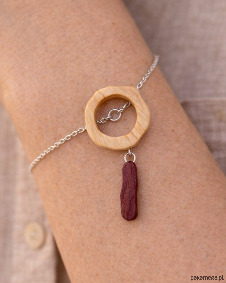 Sercem tej biżuterii artystycznej są ręcznie wykonane elementy z naturalnego drewna egzotycznego: