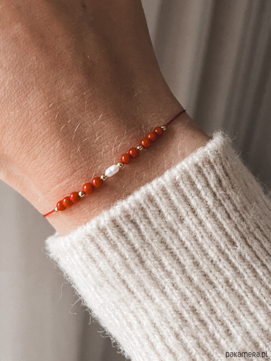 Wykonana na wytrzymałej, nylonowej nici z koralu, perły oraz srebrnych koralików próby 925 pozłacanych 24K złotem. Piękny czerwony odcień koralu to idealny dodatek do świątecznej stylizacji.
