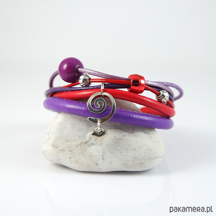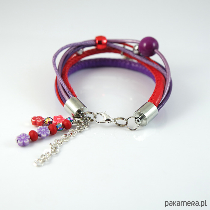 Bransoletka zrobiona jest z rzemieni z eko-skóry, skóry naturalnej oraz sznurków i koralików.