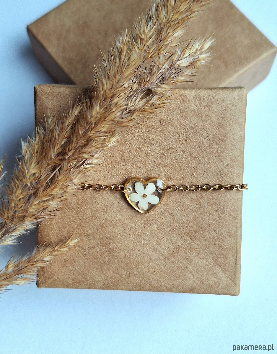 Bransoletka serduszko z białą niezapominajką
