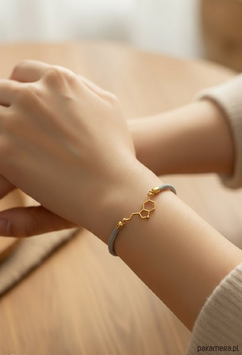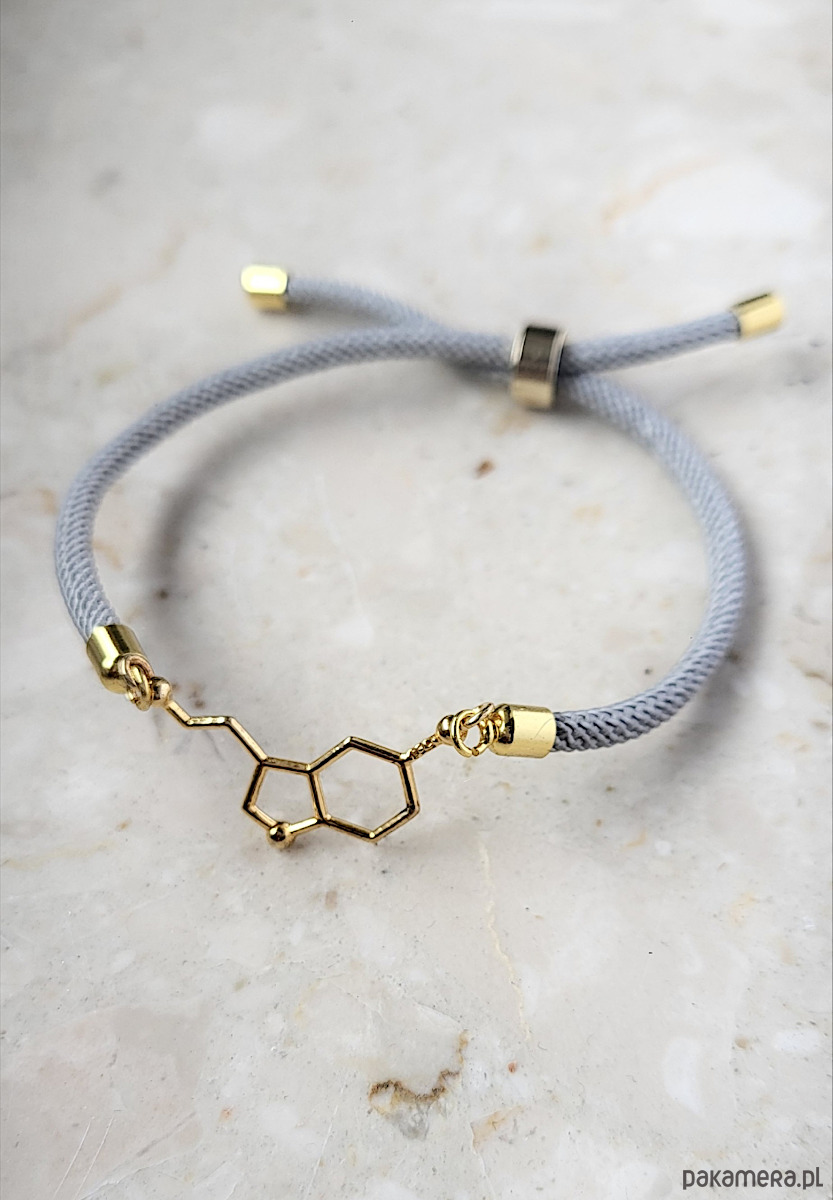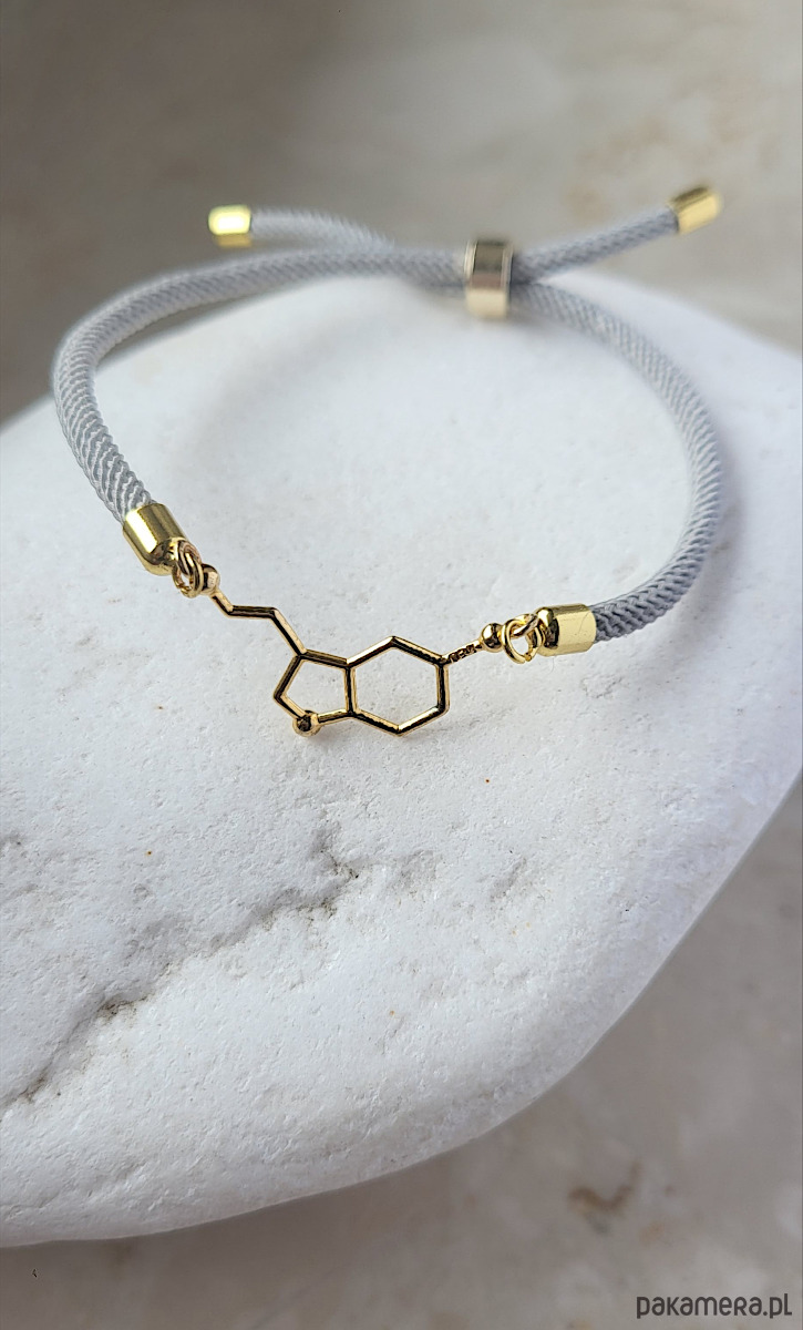 Bransoletka wykonana z jubilerskiego sznureczka wykończonego elementami ze stali nierdzewnej, ozdobiona zawieszką ze srebra pokrytego 24 K złotem, w kształcie wzoru molekularnego serotoniny.