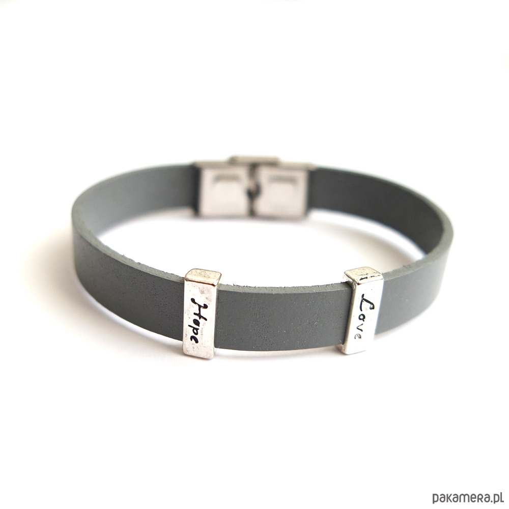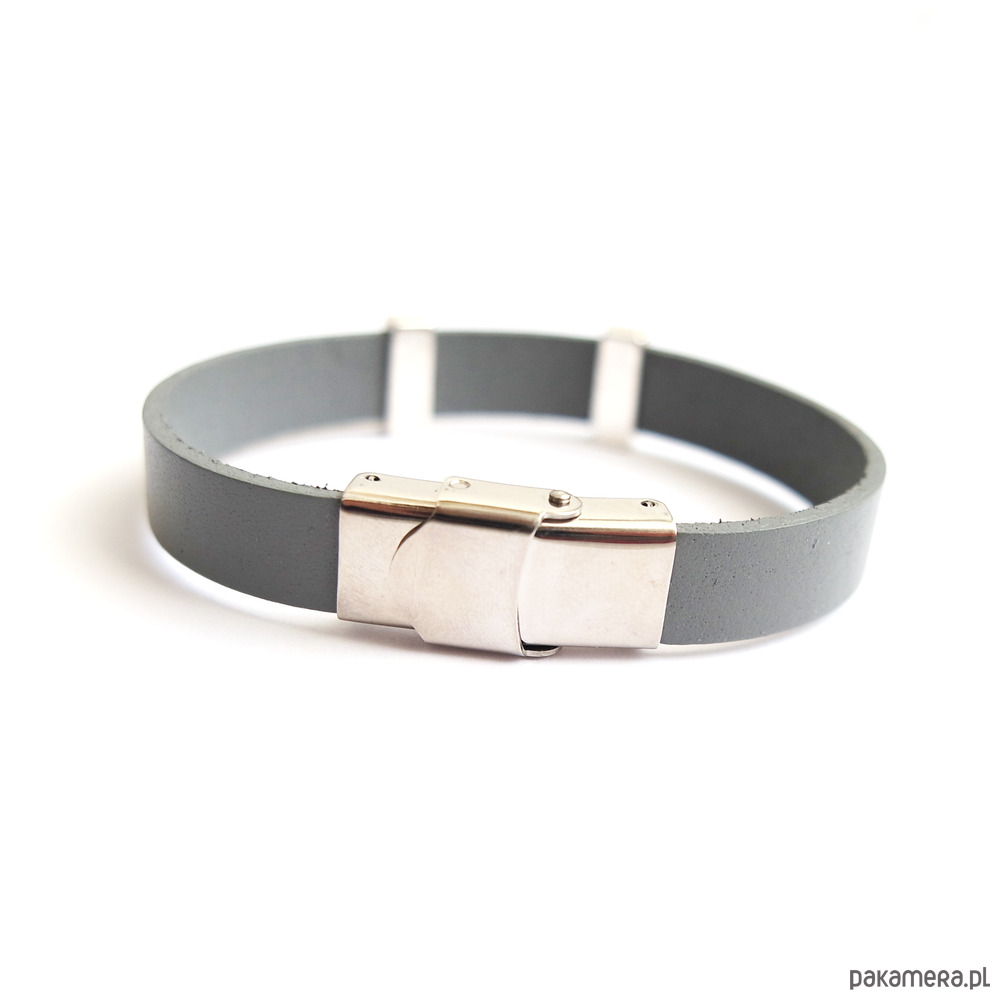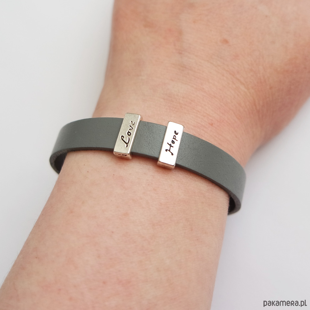 Przekładki umieszczone na szarym, skórzanym rzemieniu o szerokości 1 cm.