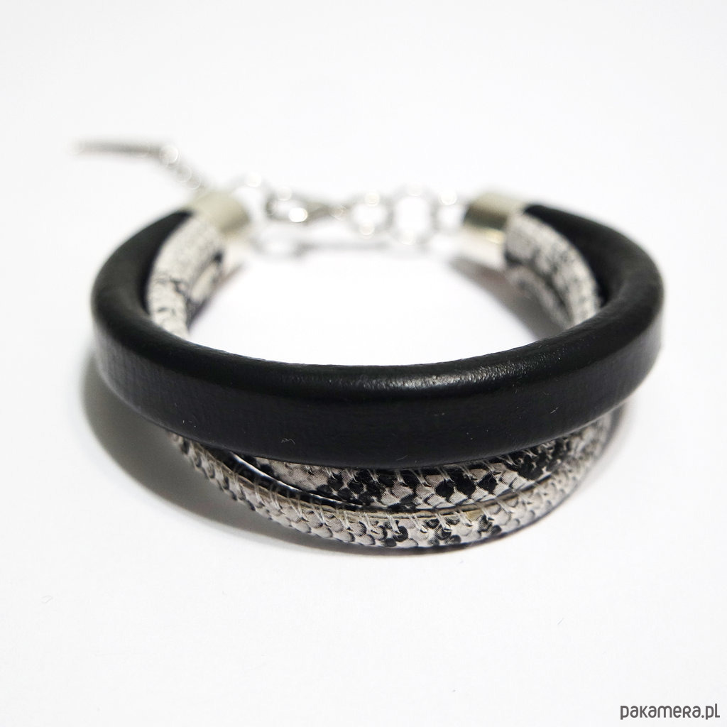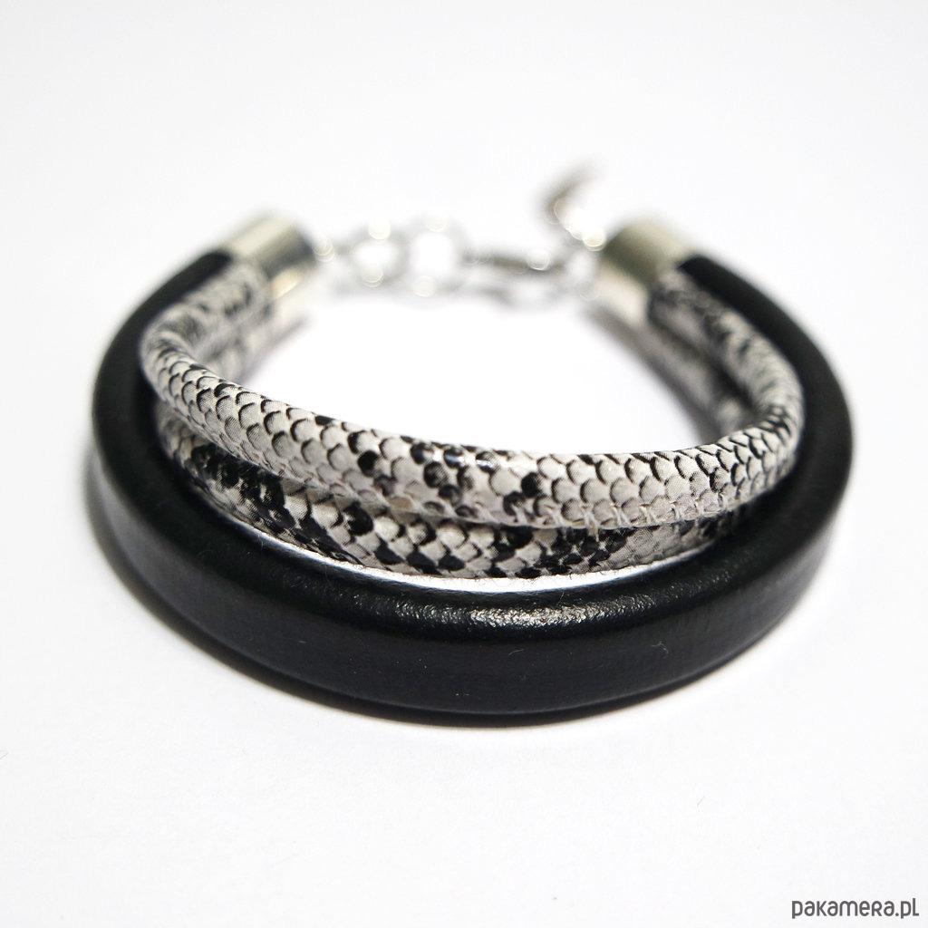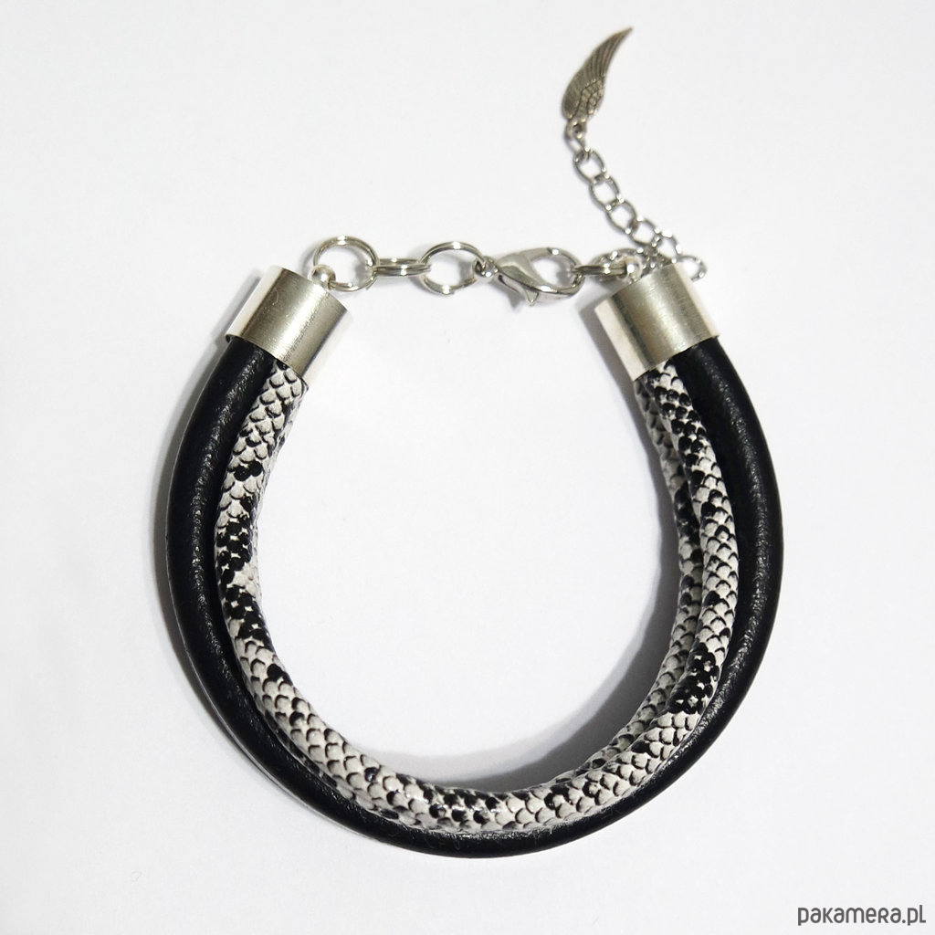 Bransoletka skórzana, wężowa - unisex, czarna, biała