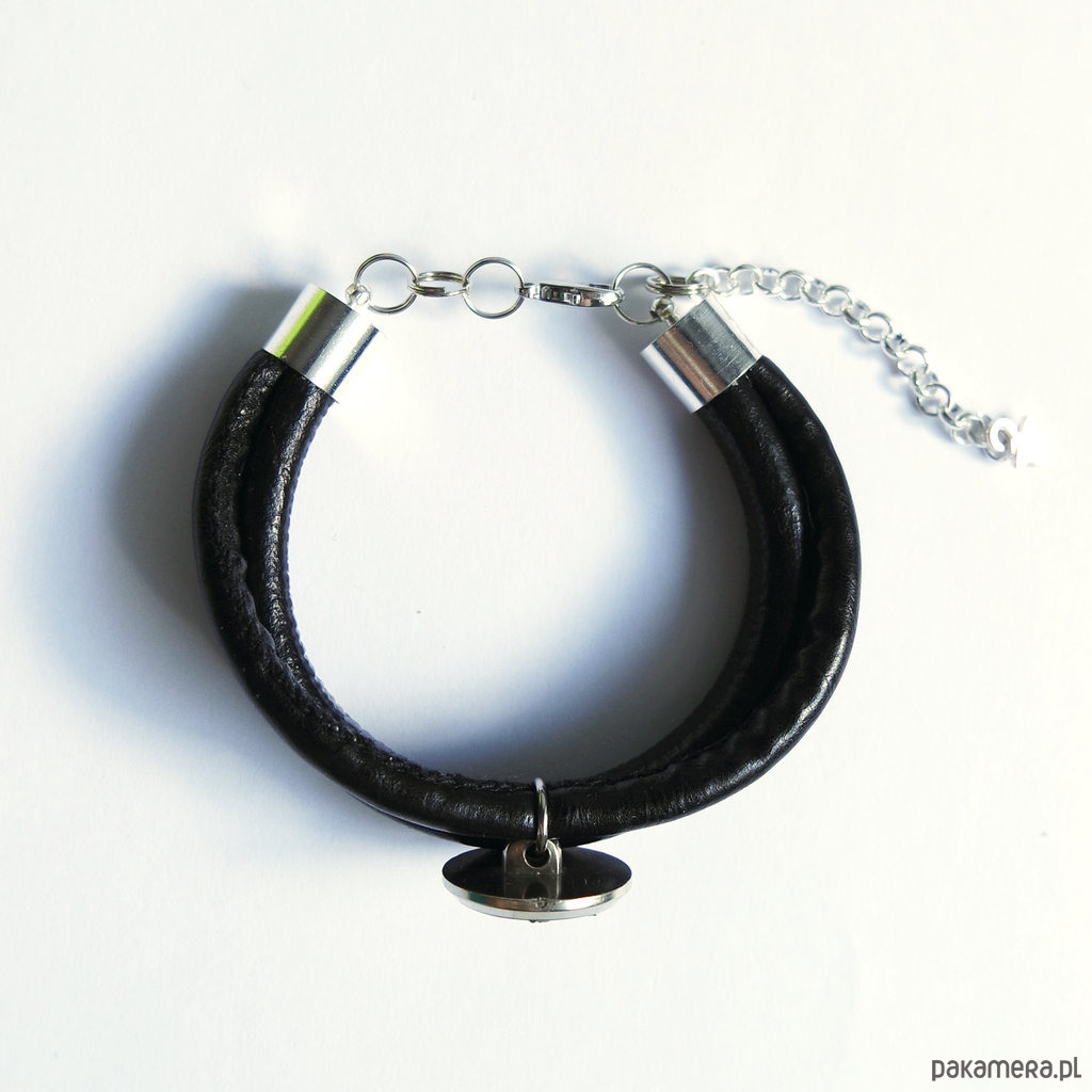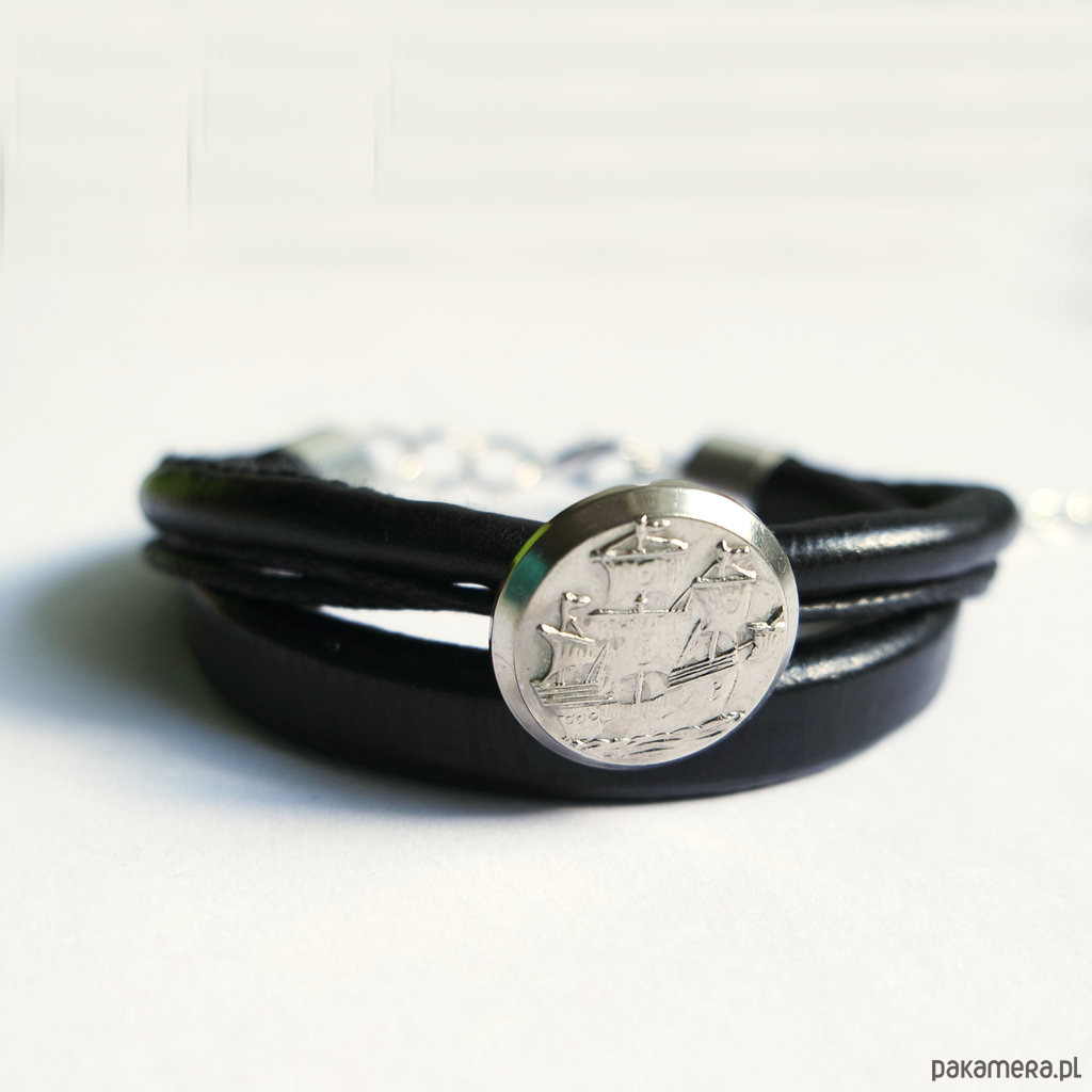 Bransoletka skórzana - Żaglowiec - unisex, czarna, marynarska