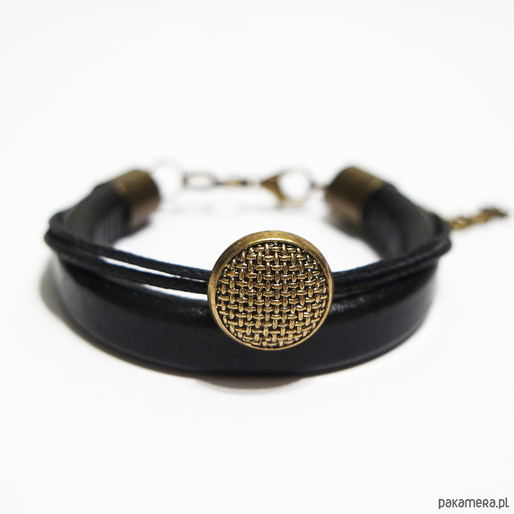Bransoletka skórzana - Złoty guzik - unisex, czarna